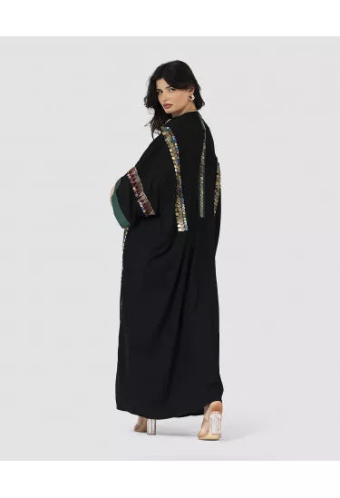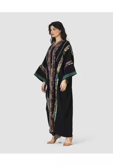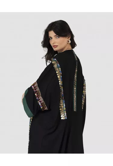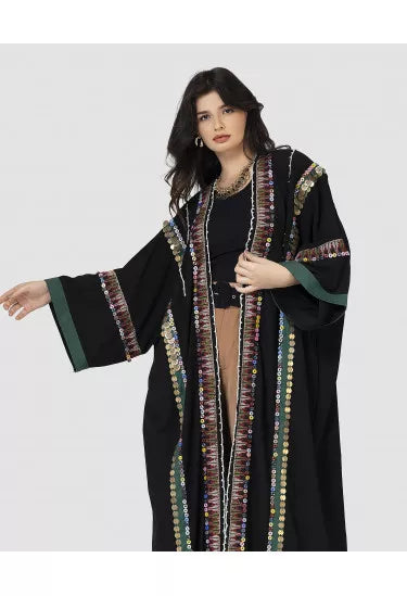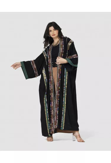 أبرزي جمالك بطابع شرقي راقٍ مع هذا البشت اليدوي الفاخر، المصنوع من خامة ناعمة عالية الجودة مع تطريز يدوي ملون على الأطراف، يعكس الذوق الخليجي الأصيل بلمسة عصرية. يتميز البشت بلونه الأسود الكلاسيكي الذي يبرز جمال النقشة المطرزة يدويًا، مع حواف خضراء تضيف عمقًا وأناقة للتصميم.