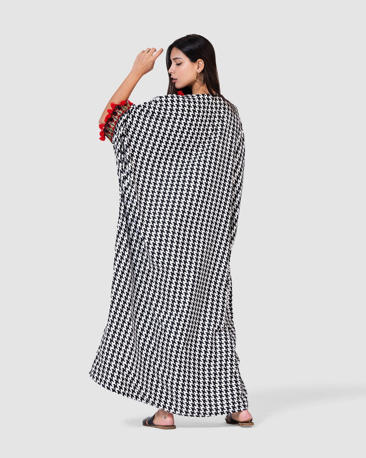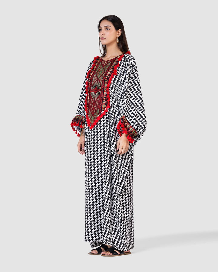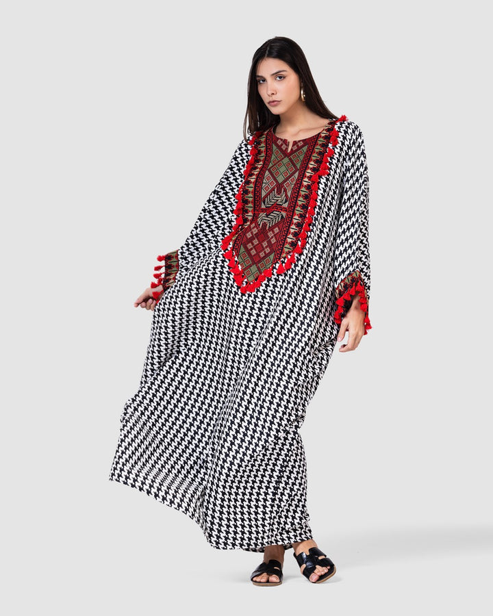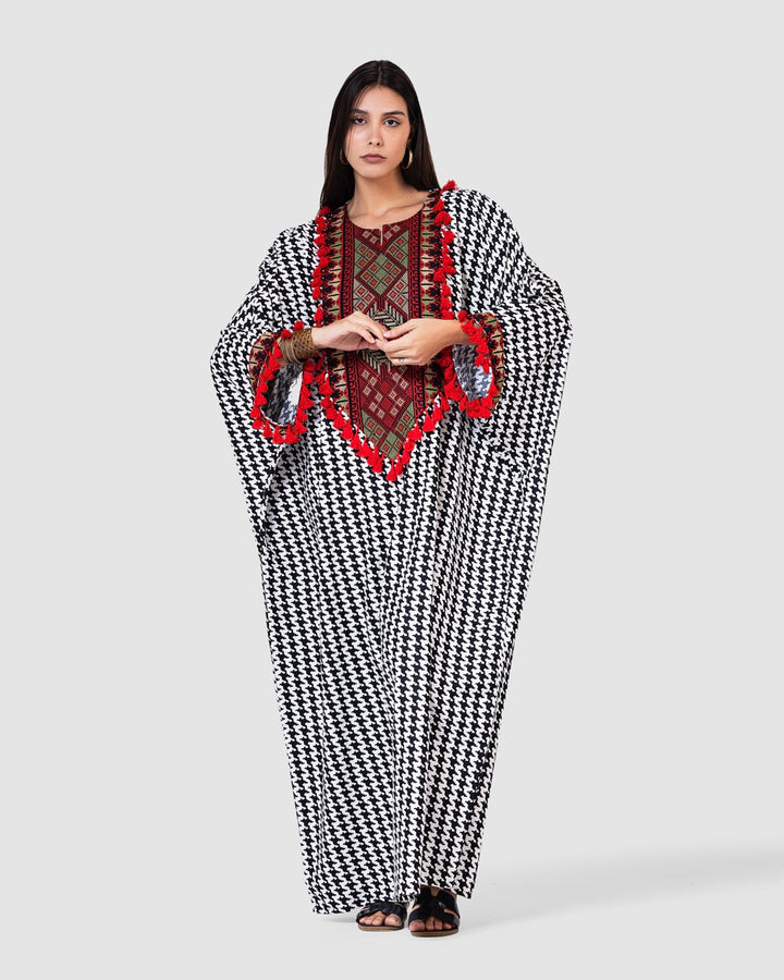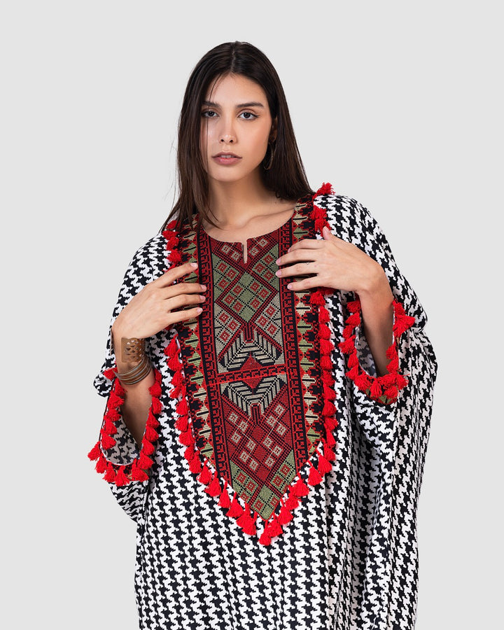 مصنوعة من خامة ناعمة ومنسدلة، بتصميم واسع وانسيابي يمنحك حرية وأناقة مطلقة. النقشة الأساسية بالأبيض والأسود مستوحاة من نمط الـ Houndstooth الكلاسيكي، تمتزج مع تطريز أحمر فلسطيني/بدوي أصيل يغطي منطقة الصدر والأكمام، ما يمنحك مزيجًا جريئًا من الحداثة والتراث.