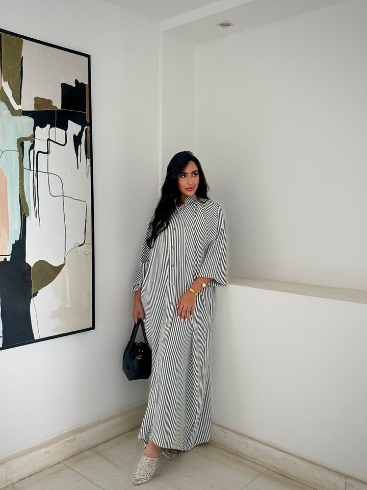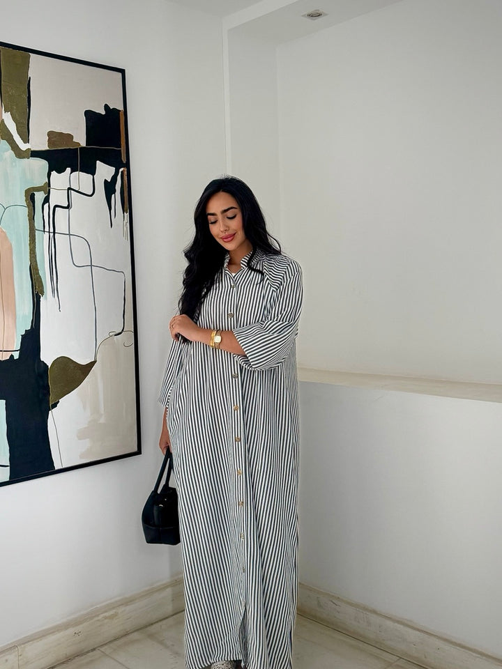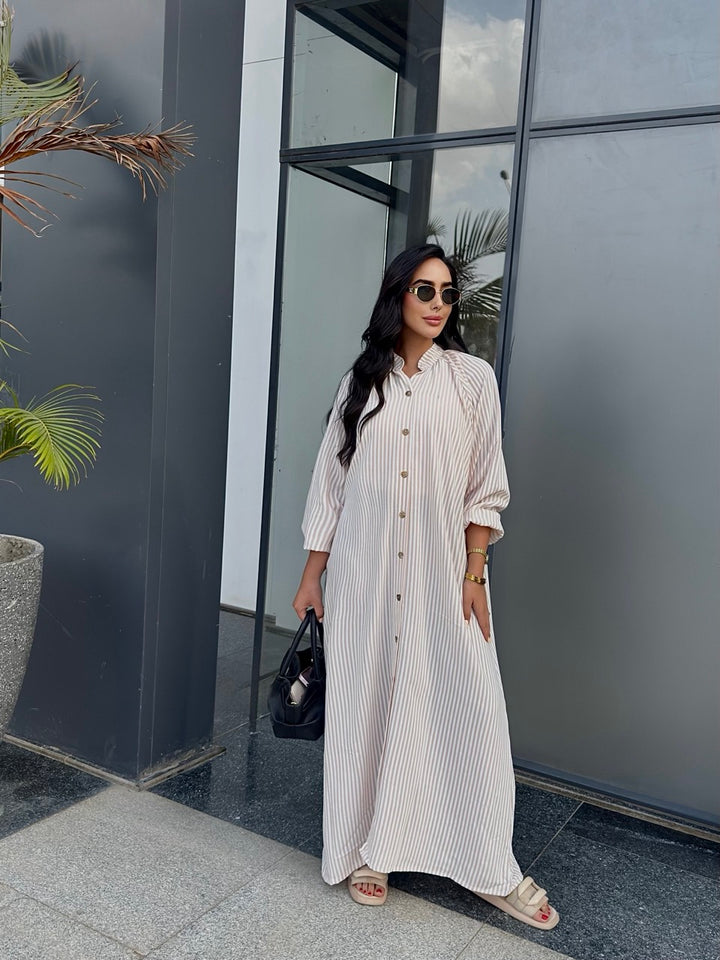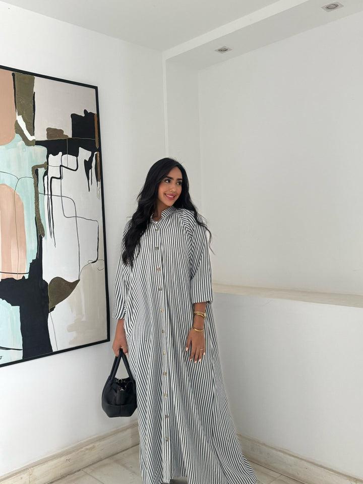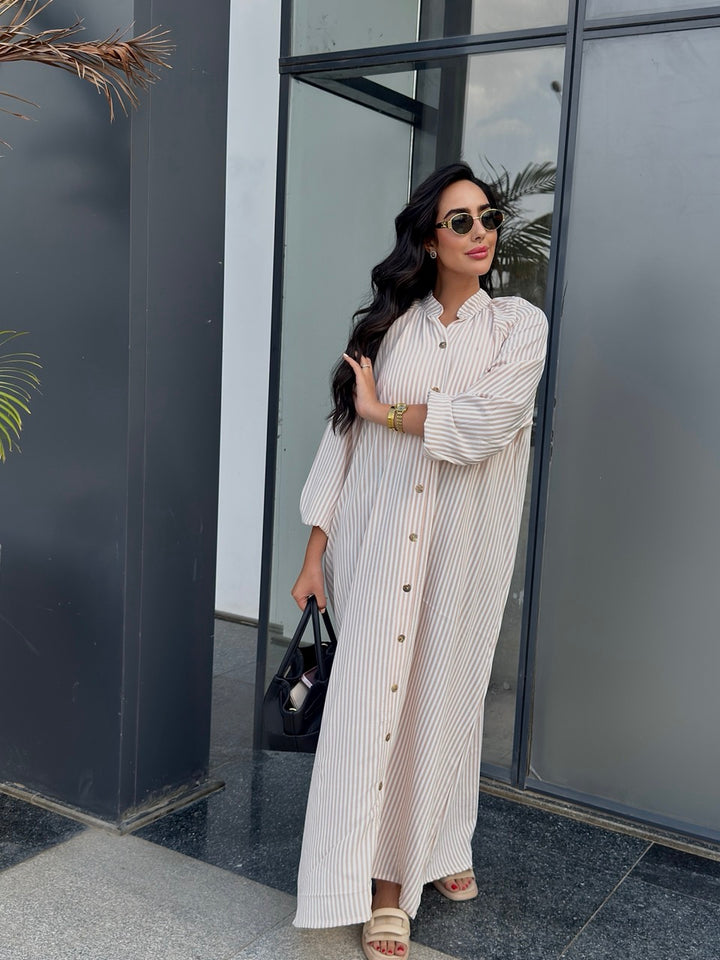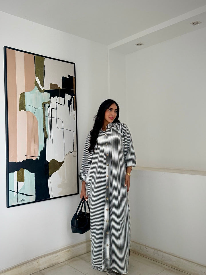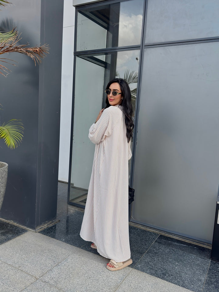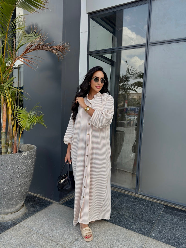 ارتقي بإطلالتك اليومية مع هذا الدريس الواسع المستوحى من الأناقة الإسبانية. تصميم قميص طويل بأزرار أمامية كاملة يتيح لك ارتداءه كفستان محتشم أو كعباية خفيفة فوق بنطال، بينما تضفي الخطوط الطولية الدقيقة مظهراً انسيابياً يطيل القوام ويبرز أناقتك بلا مجهود. الخامة براد قطنية-كتانية خفيفة تتنفس مع حرارة الصيف وتمنحك إحساساً منعشاً طوال اليوم.