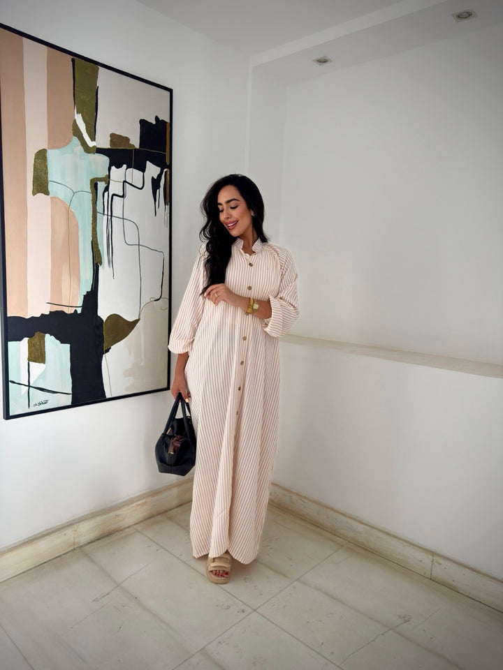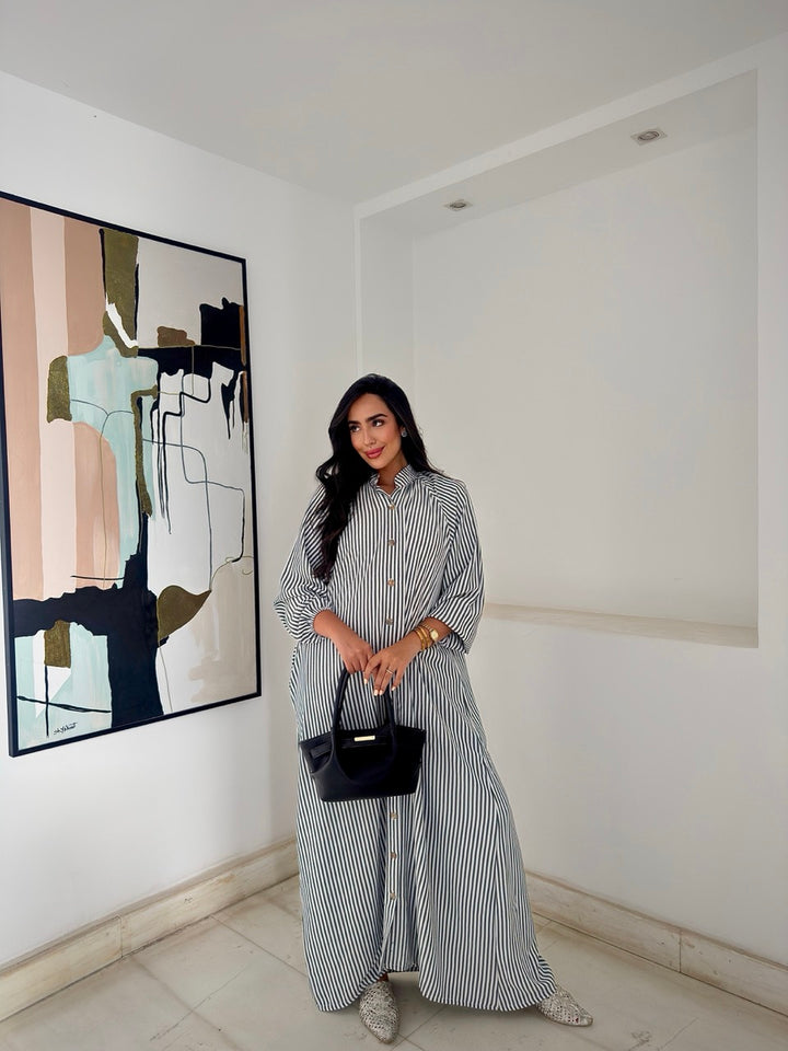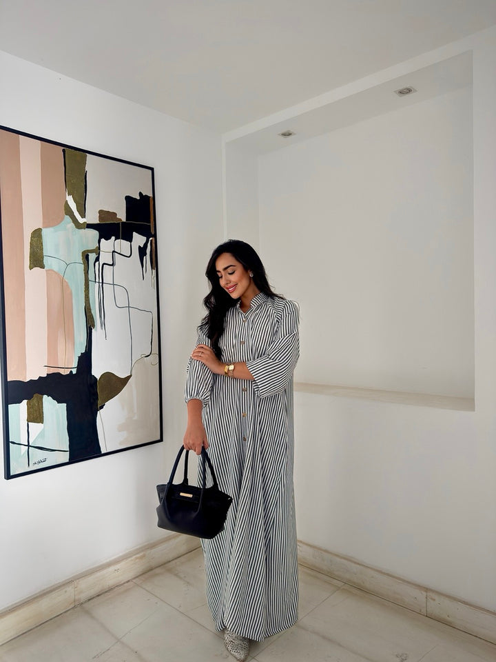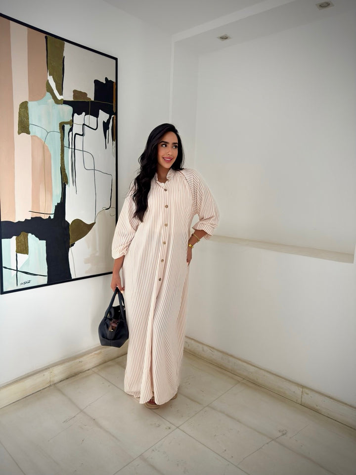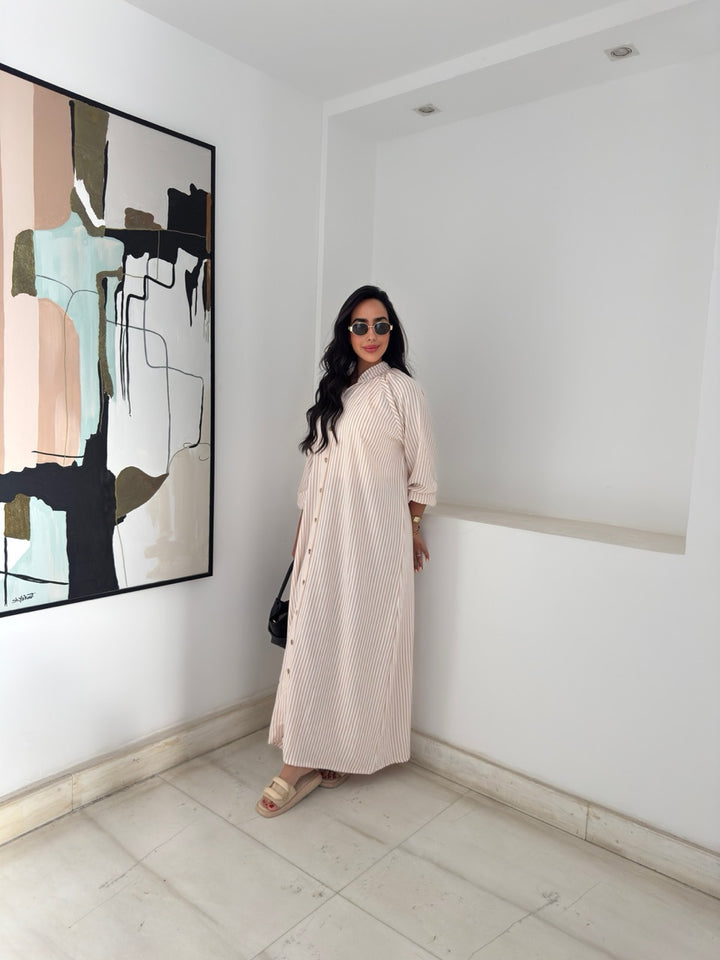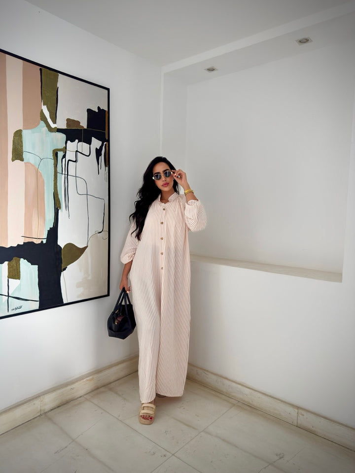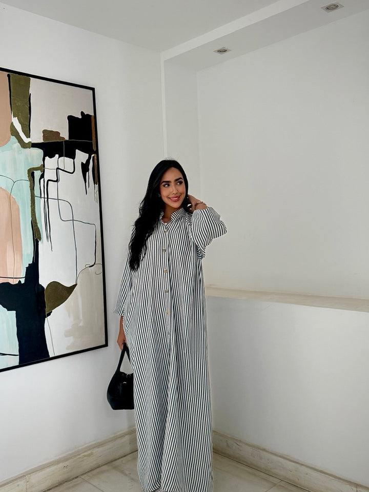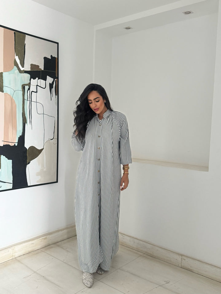 ارتقي بإطلالتك اليومية مع هذا الدريس الواسع المستوحى من الأناقة الإسبانية. تصميم قميص طويل بأزرار أمامية كاملة يتيح لك ارتداءه كفستان محتشم أو كعباية خفيفة فوق بنطال، بينما تضفي الخطوط الطولية الدقيقة مظهراً انسيابياً يطيل القوام ويبرز أناقتك بلا مجهود. الخامة براد قطنية-كتانية خفيفة تتنفس مع حرارة الصيف وتمنحك إحساساً منعشاً طوال اليوم.
