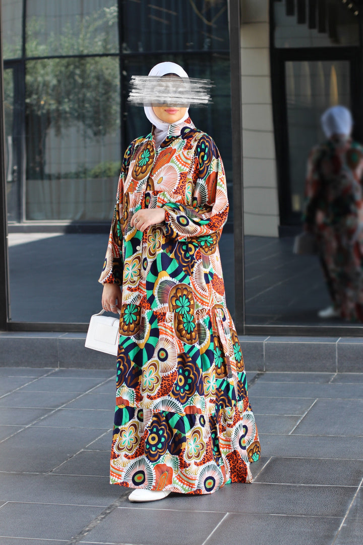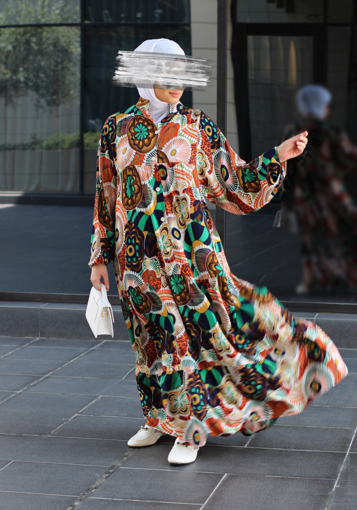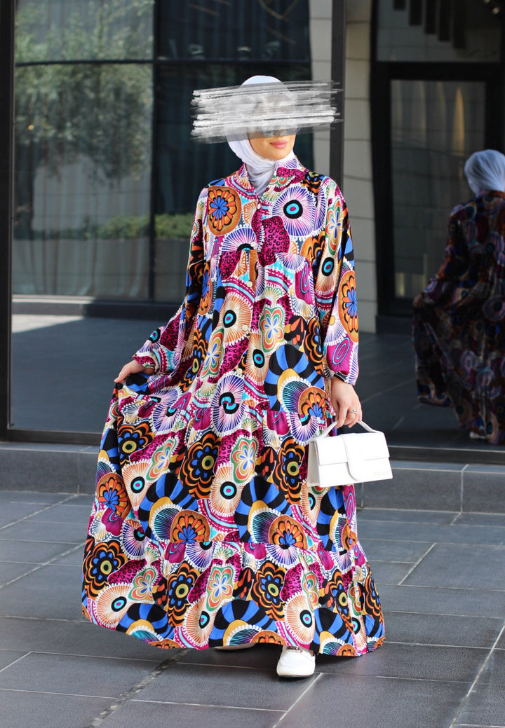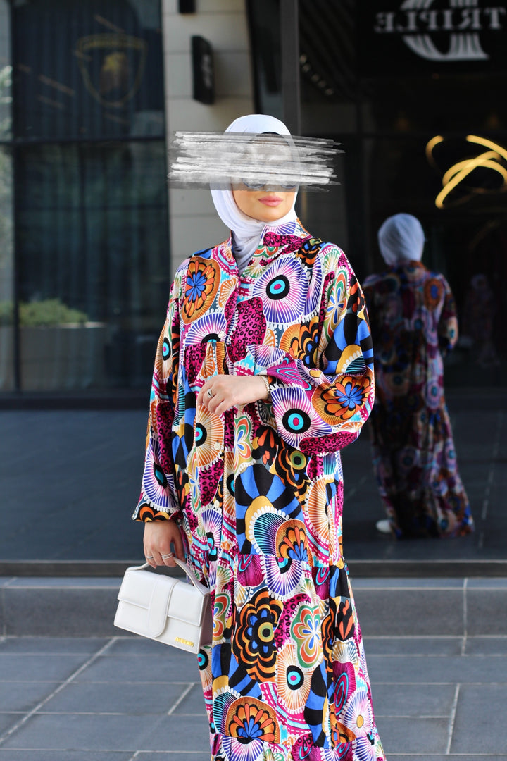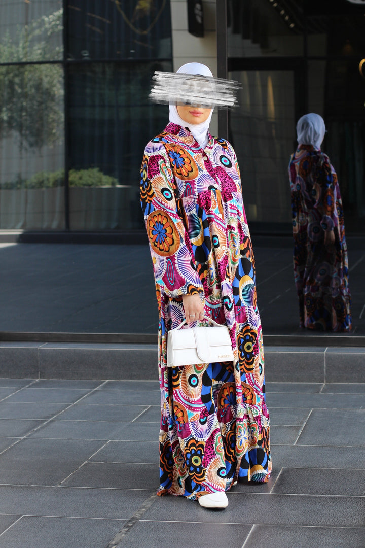 إذا كنتِ تبحثين عن قطعة تدمج بين الراحة الكاملة والأناقة الراقية، فهنا فستانك المُفضل. مصنوع من خامة قطنية نقية 100%، ناعمة على البشرة وخفيفة على الجسم، بقصّة فضفاضة مثالية للحركة والتهوية. الطباعة الجرافيكية الجريئة والموزعة بعناية تضيف طابع فني ساحر، يجمع بين الحداثة والأنوثة.