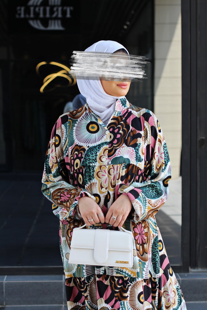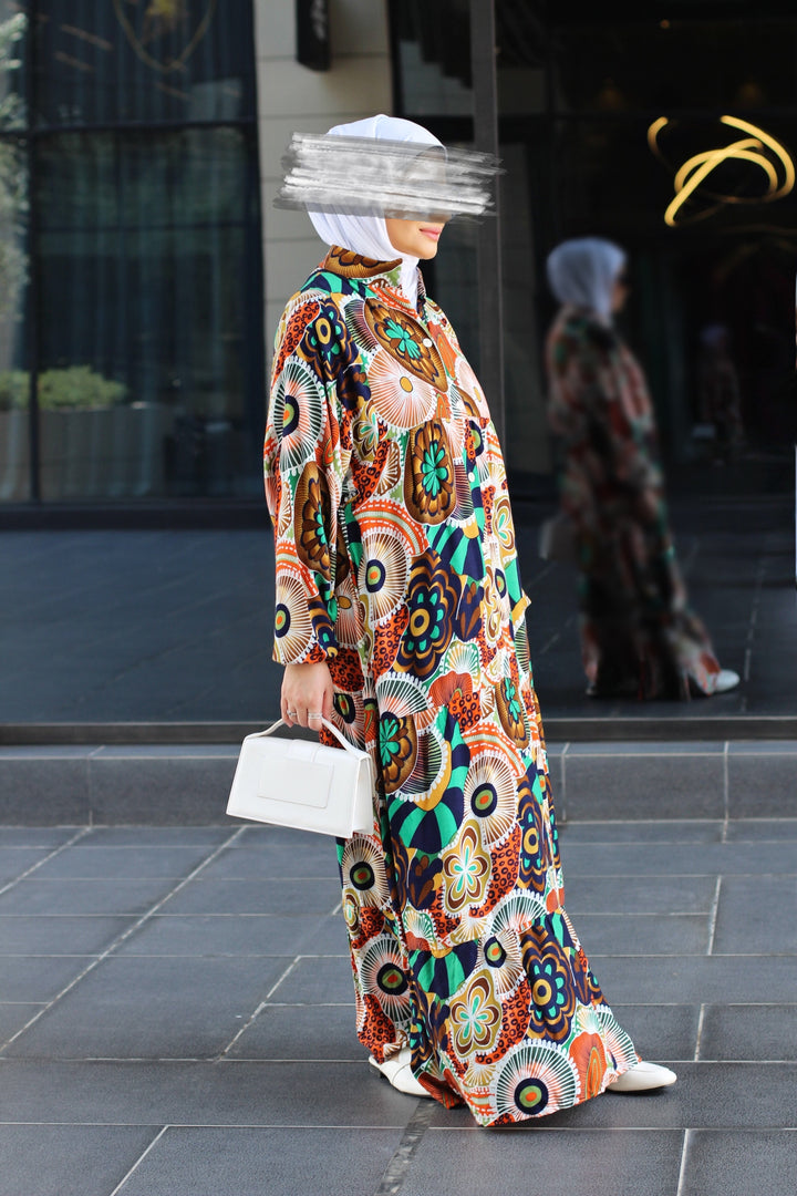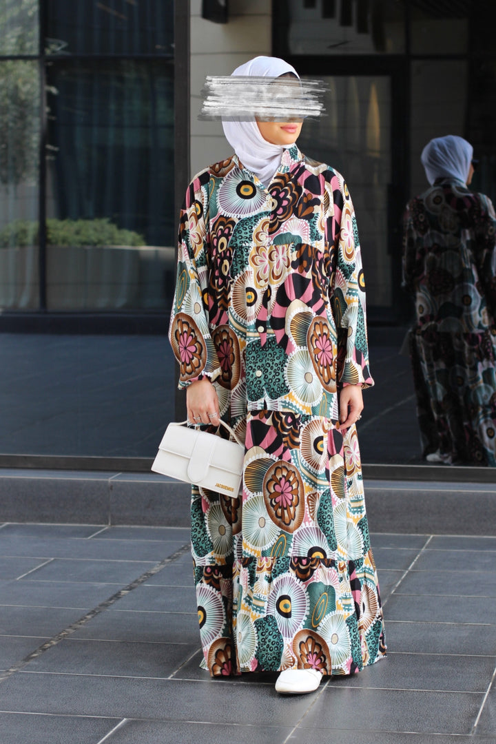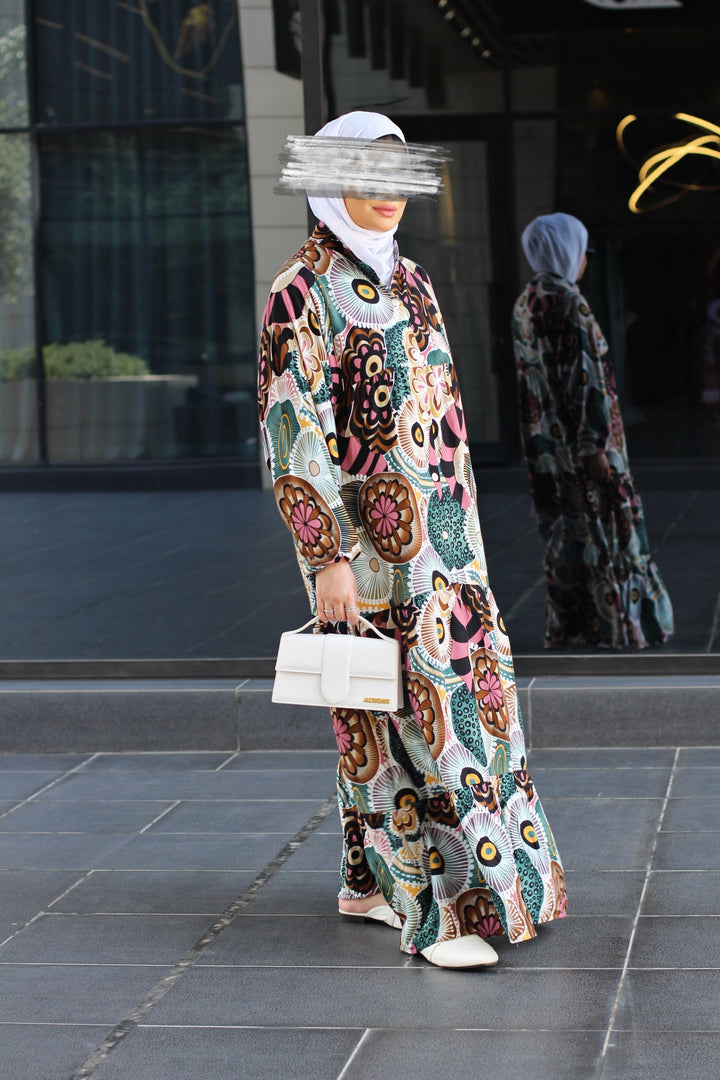 إذا كنتِ تبحثين عن قطعة تدمج بين الراحة الكاملة والأناقة الراقية، فهنا فستانك المُفضل. مصنوع من خامة قطنية نقية 100%، ناعمة على البشرة وخفيفة على الجسم، بقصّة فضفاضة مثالية للحركة والتهوية. الطباعة الجرافيكية الجريئة والموزعة بعناية تضيف طابع فني ساحر، يجمع بين الحداثة والأنوثة.