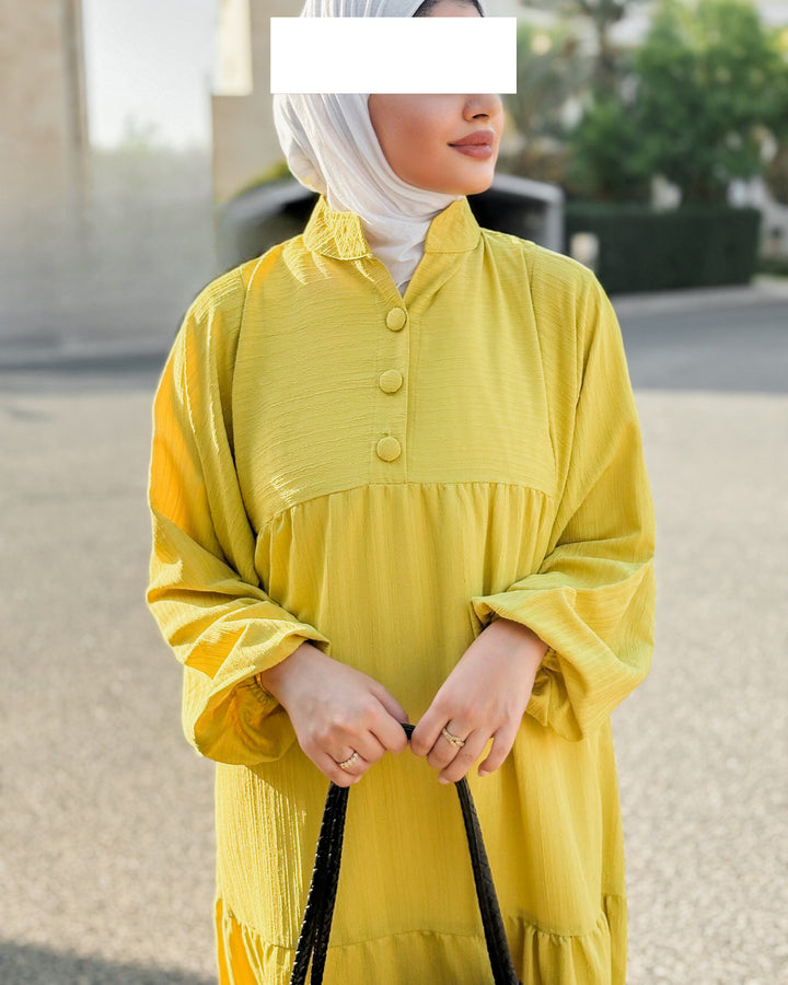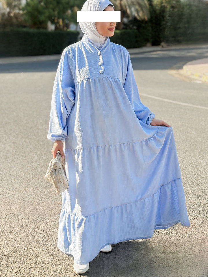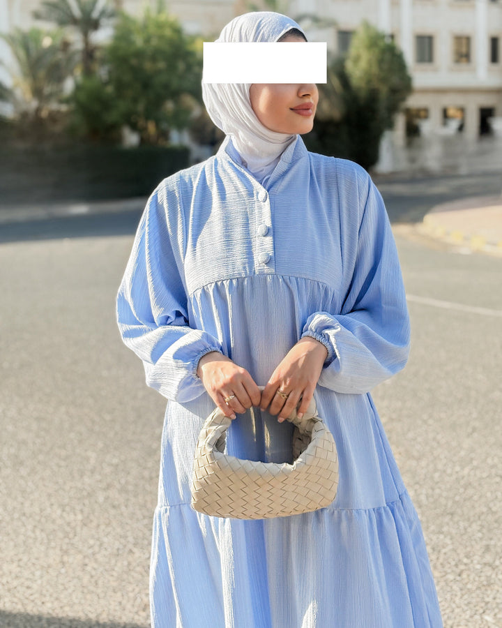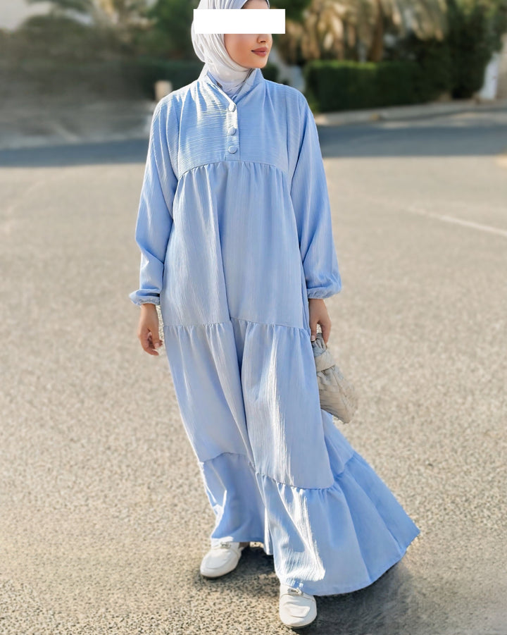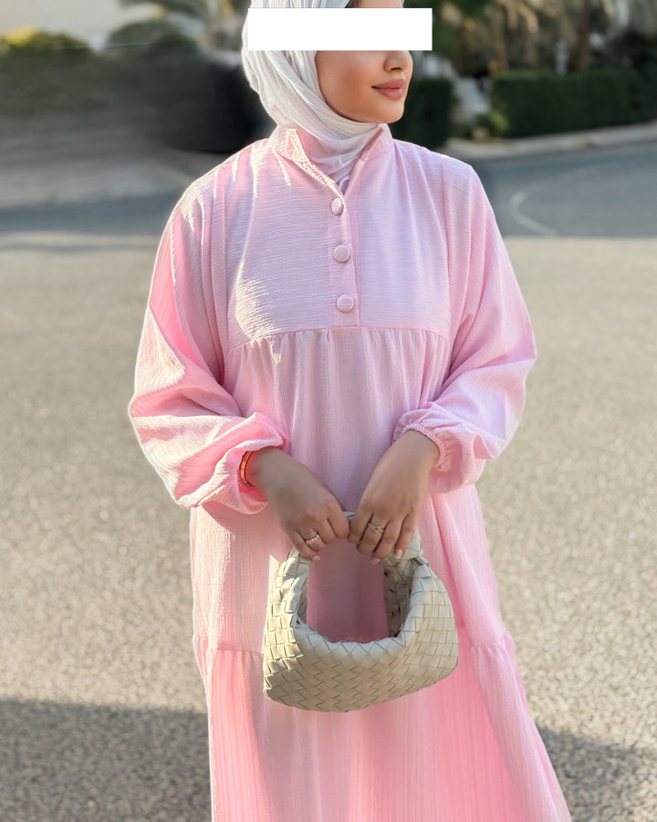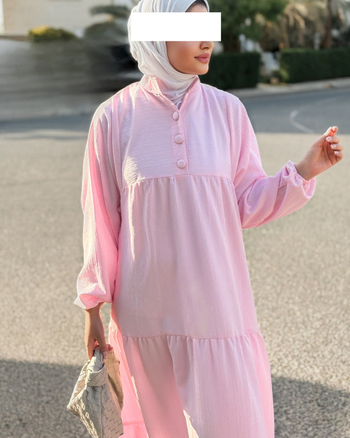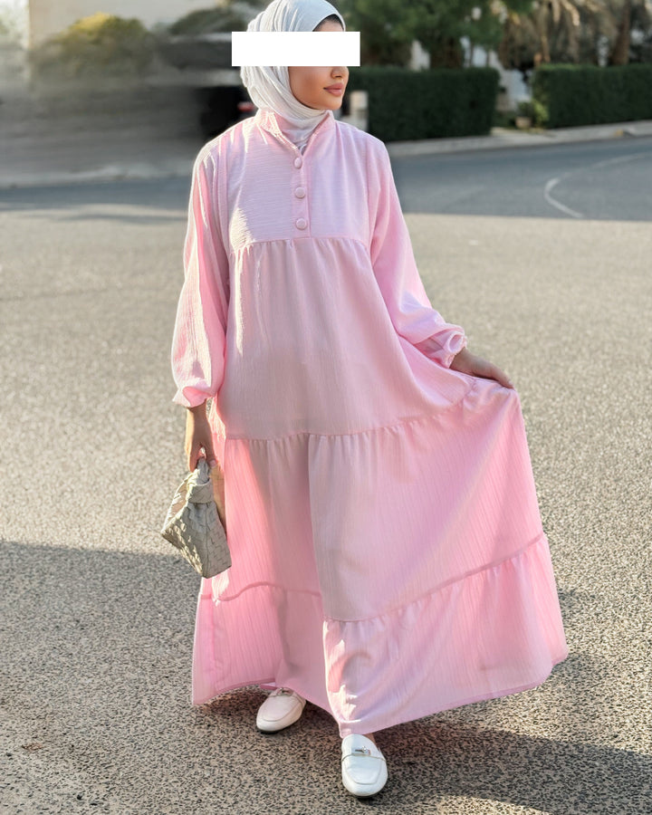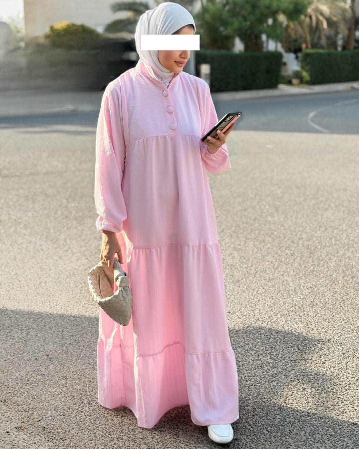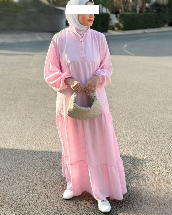 يتميز الفستان بقصة محتشمة وواسعة، بتفاصيل بسيطة وناعمة تلائم أجواء النهار والمساء، سواء كنتِ في مشوار، أو طلعة مع الصديقات، أو حتى جلسة رمضانية.