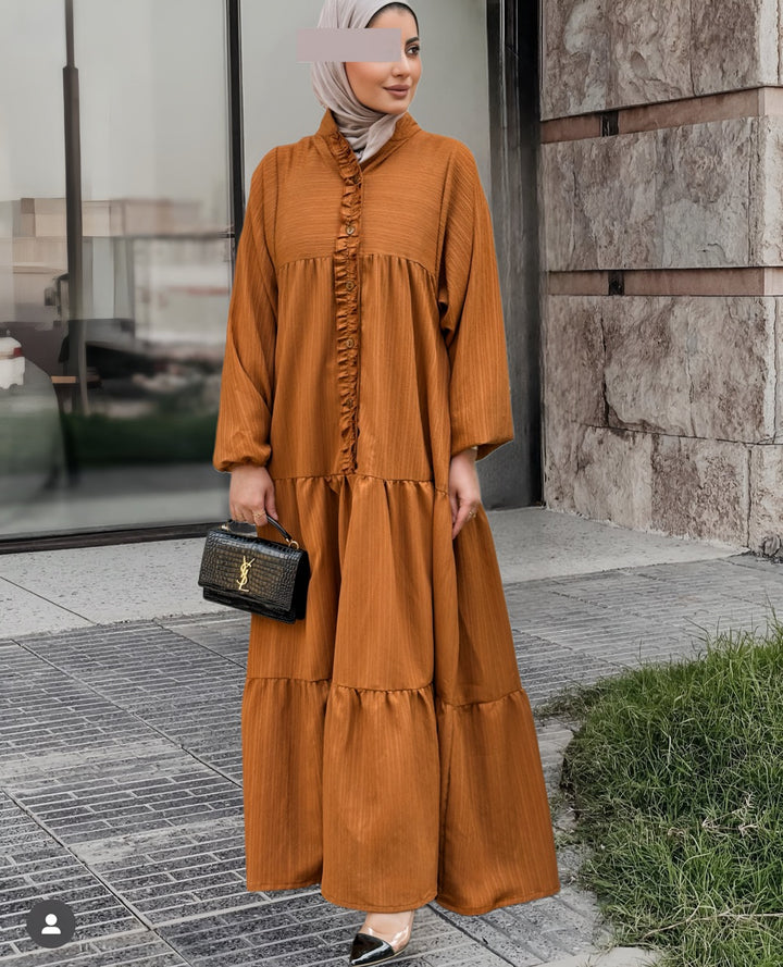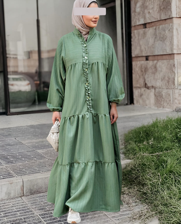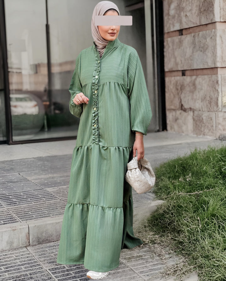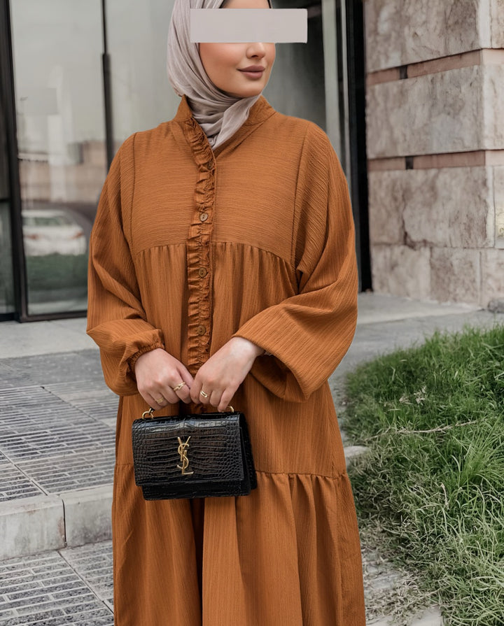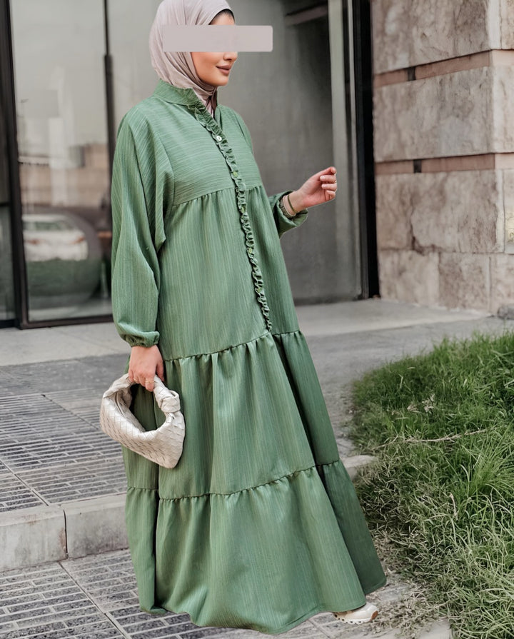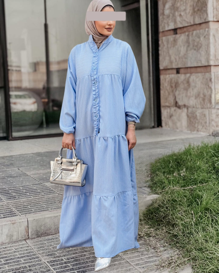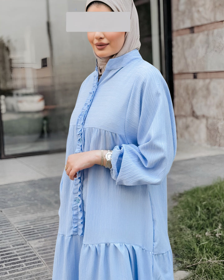 استمتعي بإطلالة صيفية ناعمة ومريحة مع هذا الفستان الكتان الصيفي المصنوع من قماش خفيف وبارد يمنحك راحة طوال اليوم مع لمسة أنثوية راقية. يأتي بتصميم طويل وفضفاض بأكمام منفوخة وتفاصيل أنيقة مثل الأزرار الأمامية والكشكشة الناعمة على الصدر، مما يضيف للفستان طابعًا بسيطًا لكنه لافت.