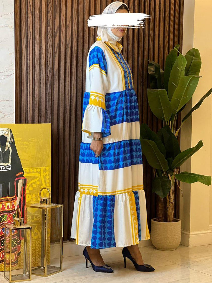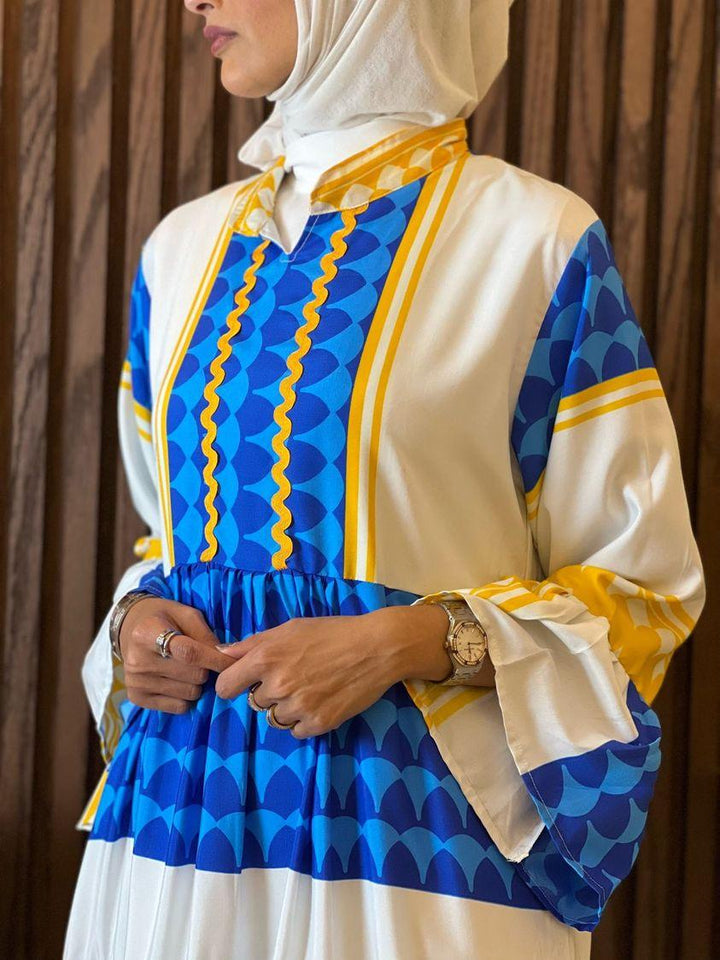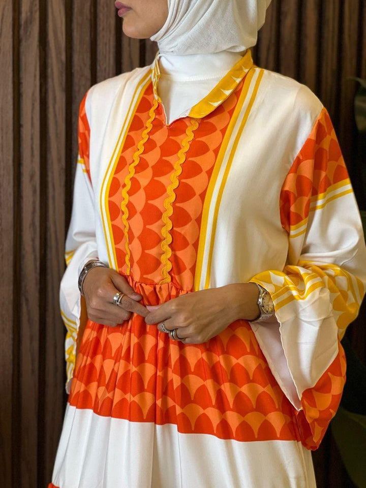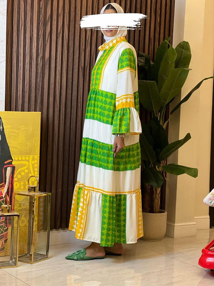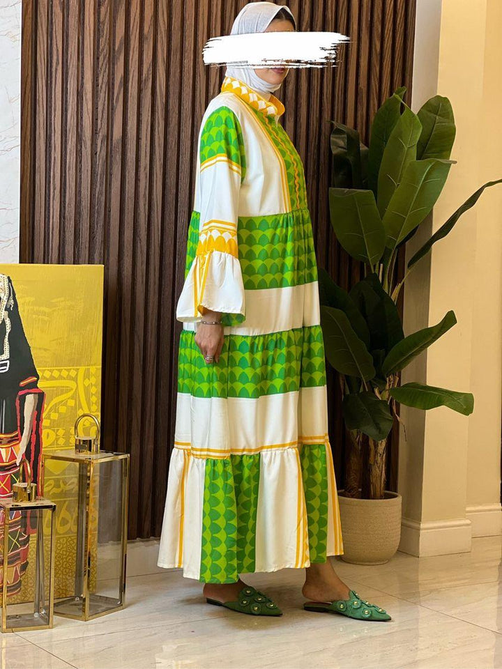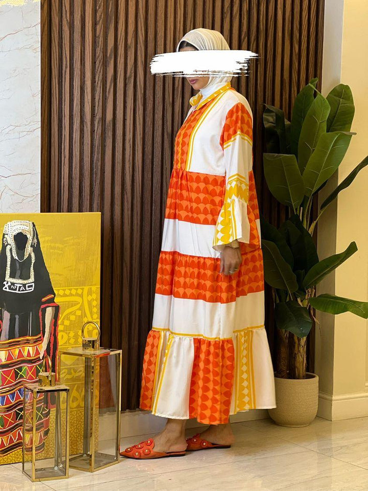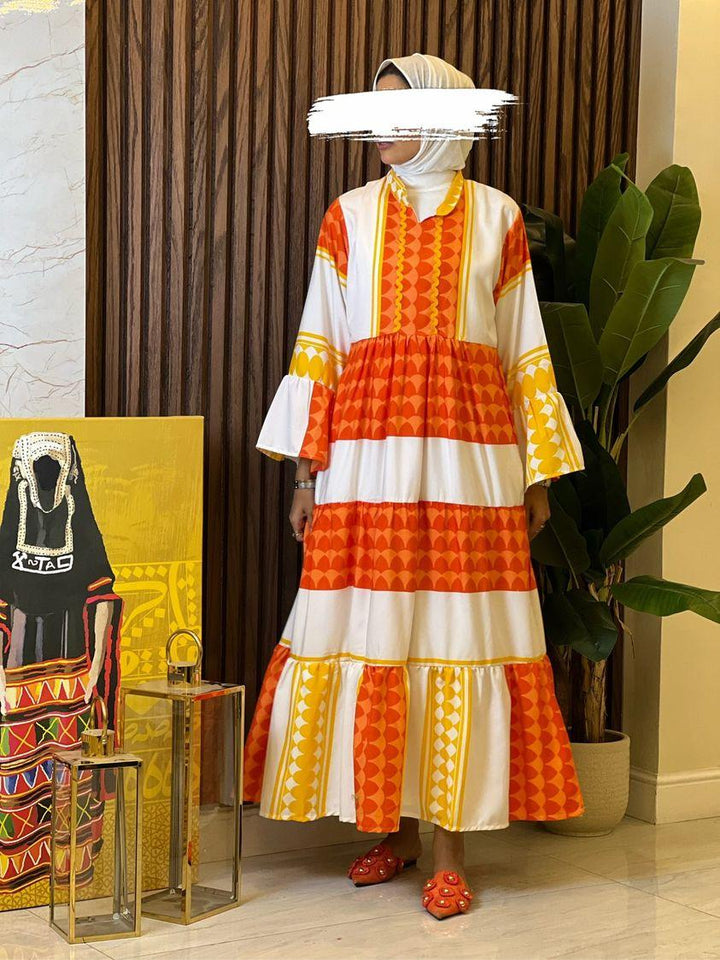 الفستان مصنوع من خامة مريحة وناعمة على البشرة، بتدرجات ألوان مبهجة: البرتقالي الناري، الأخضر النابض، أو الأزرق الملكي – كل لون يحكي حكاية، وكل تصميم يعبّر عن ذوق أنثوي فريد.