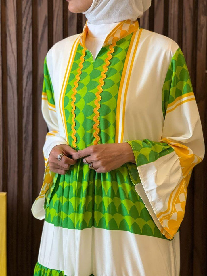 استوحي إطلالتك من أصالة التراث مع لمسة معاصرة من خلال هذا النفنوف الفاخر. تصميم طويل وانسيابي، بقصّات ناعمة وتفاصيل هندسية مستوحاة من الهوية الخليجية، مع أزرار أمامية تمنحك لمسة من التميز وسهولة في الارتداء.