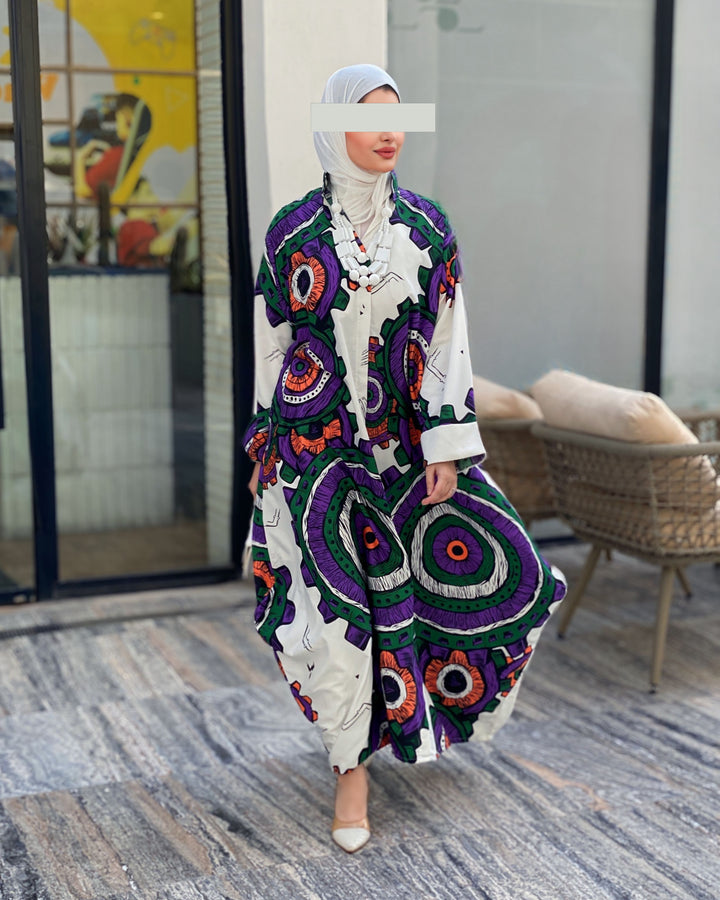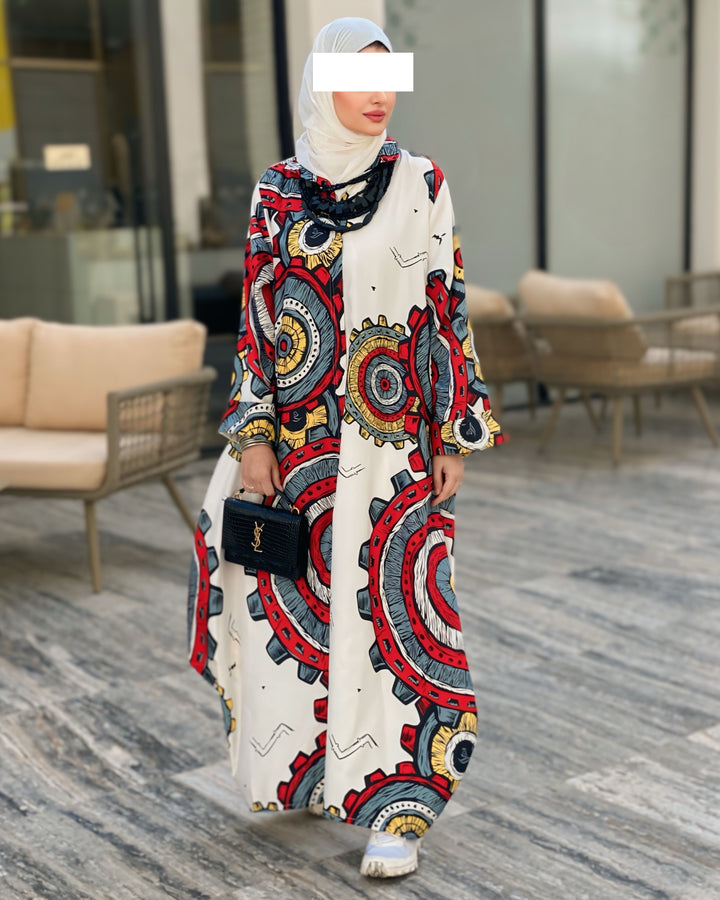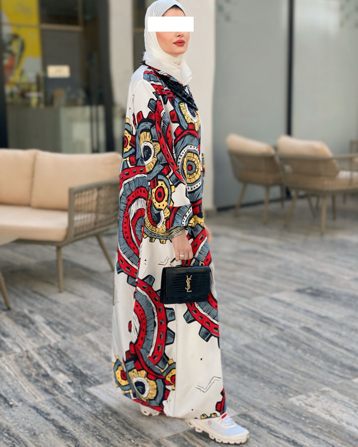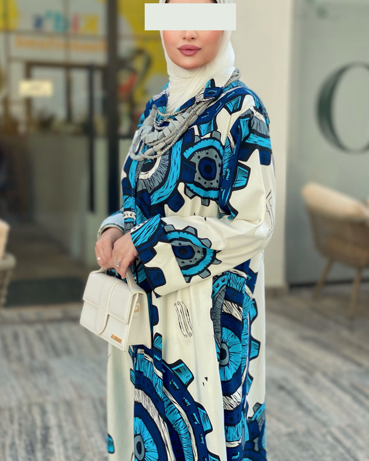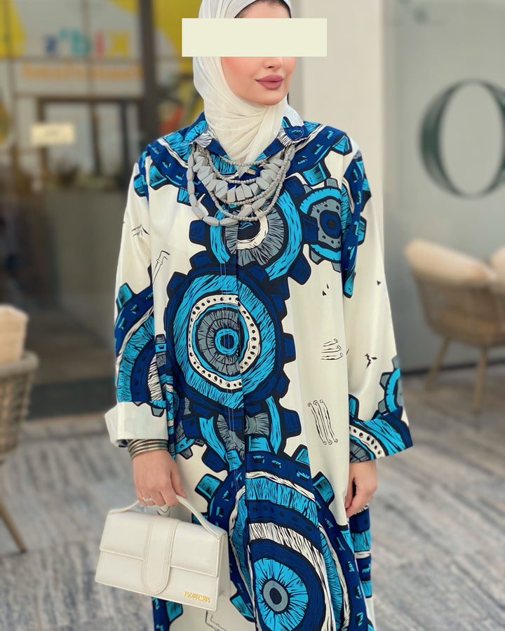 القصّة انسيابية، والأكمام واسعة بتفصيل دقيق يعطي راحة وأناقة في كل حركة. مناسب لكل الأعمار، ويضبط مع شوز بسيط أو إكسسوارات ناعمة لطلّة متكاملة.