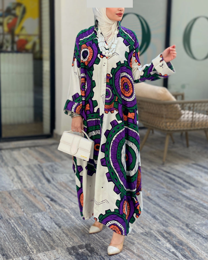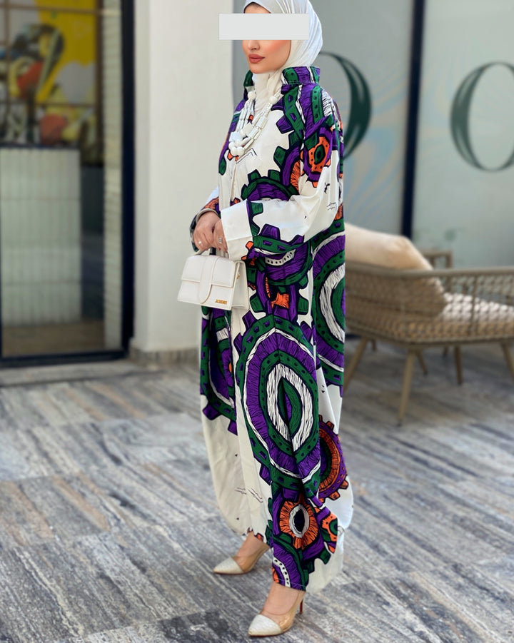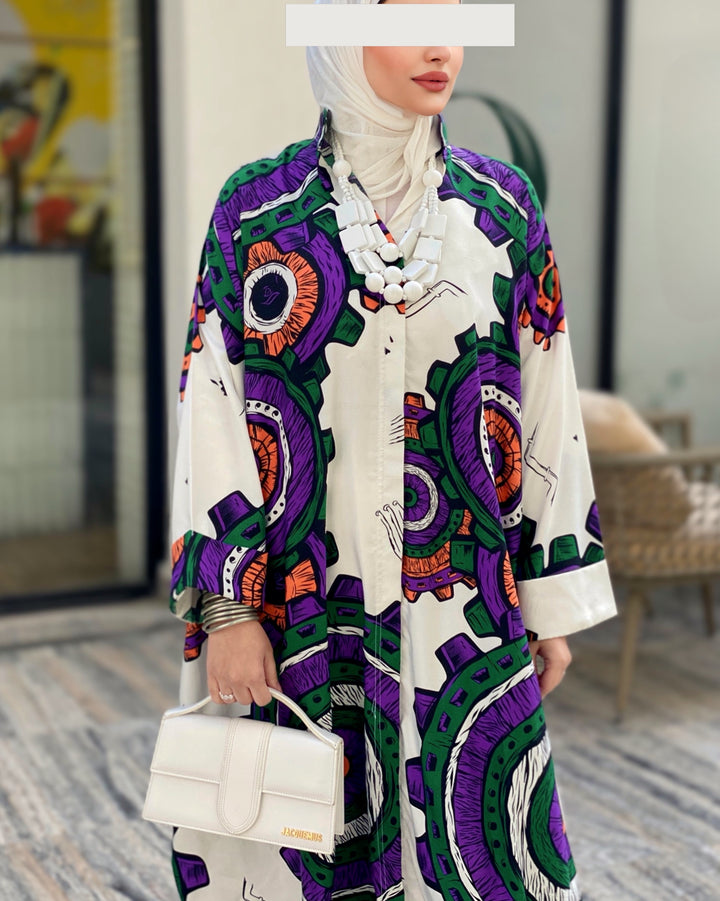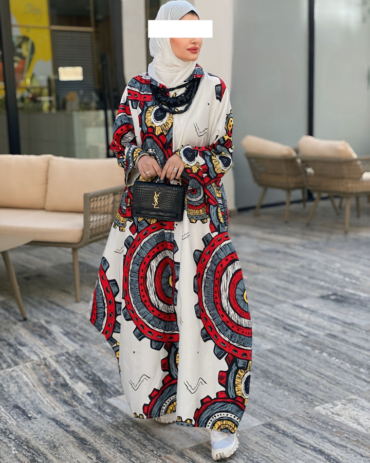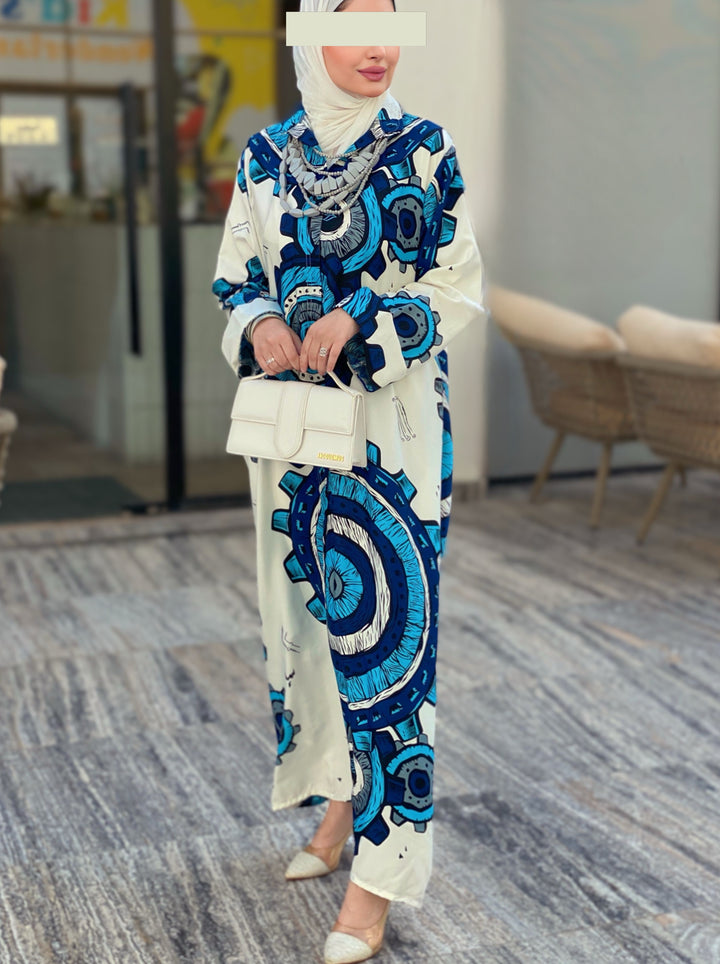 القصّة انسيابية، والأكمام واسعة بتفصيل دقيق يعطي راحة وأناقة في كل حركة. مناسب لكل الأعمار، ويضبط مع شوز بسيط أو إكسسوارات ناعمة لطلّة متكاملة.