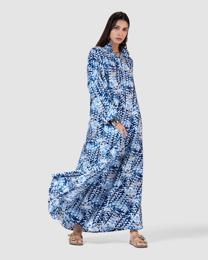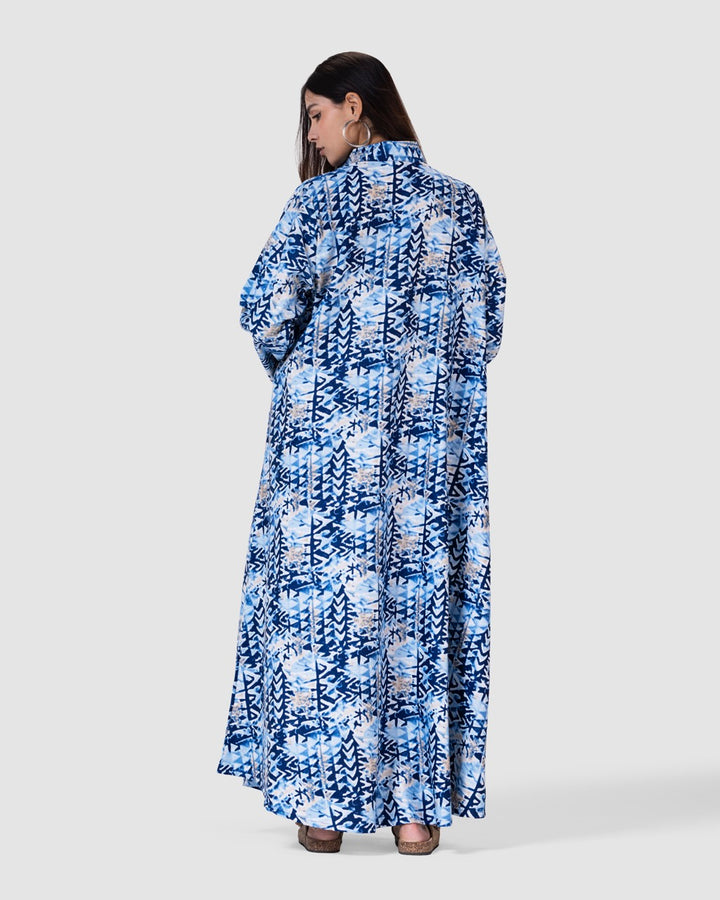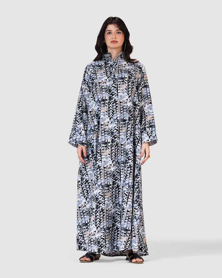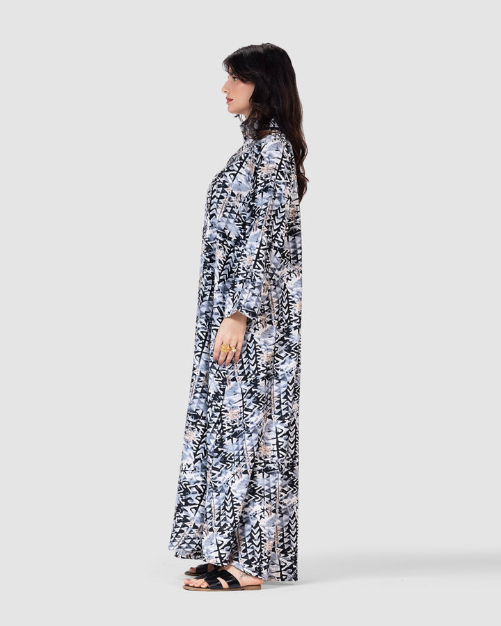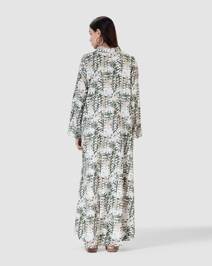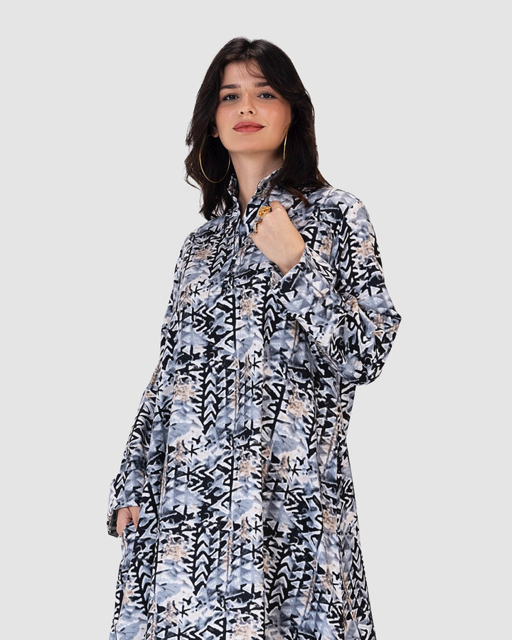 القصة الطويلة والفضفاضة تتيح لك الحركة بحرية، مع ياقة كلاسيكية وأزرار أمامية تضيف لمسة رسمية ناعمة. تصميم مثالي للمشاوير اليومية، الطلعات، أو الجلسات العائلية البسيطة.