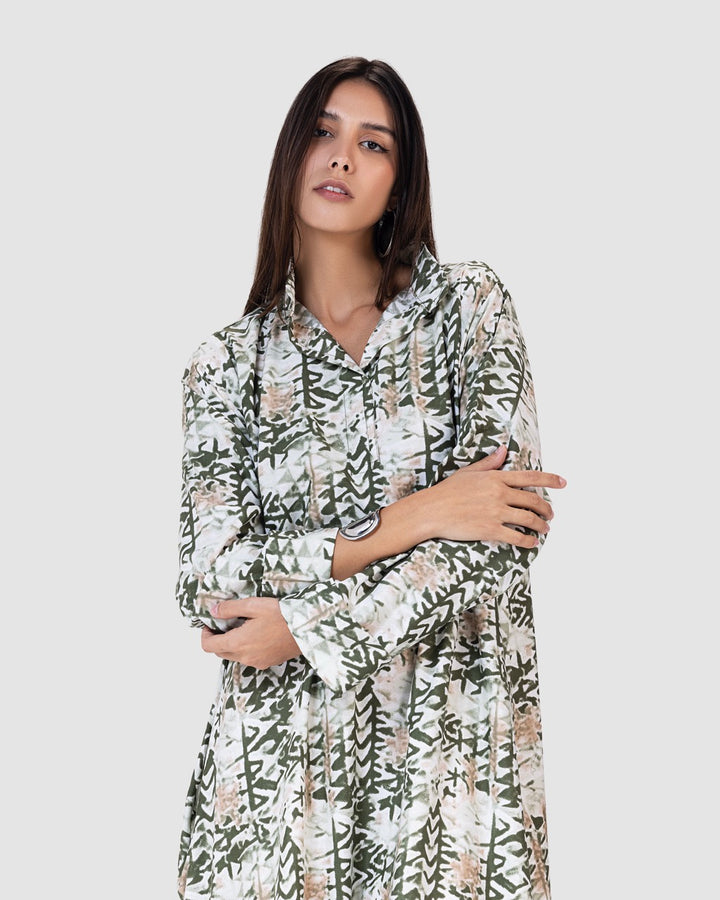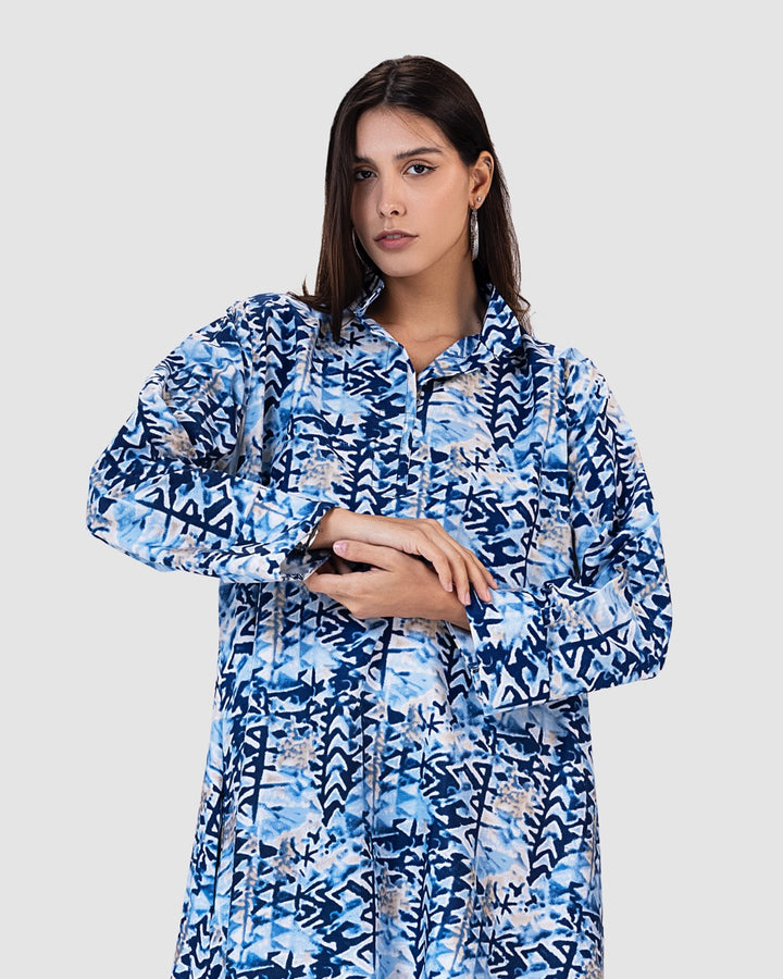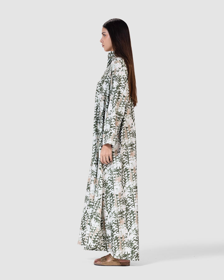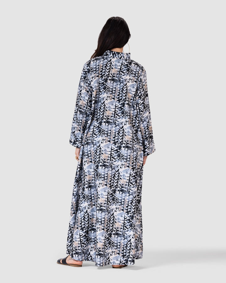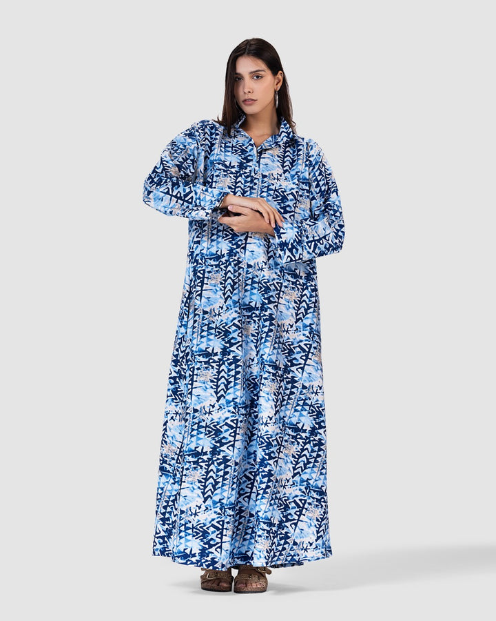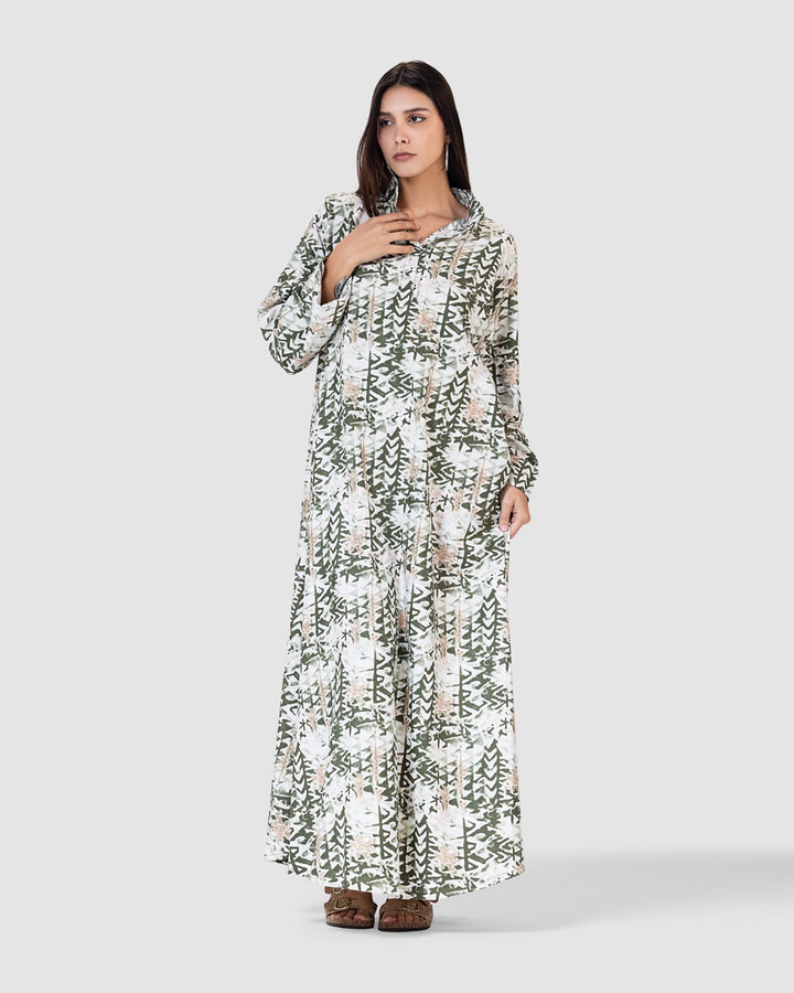القصة الطويلة والفضفاضة تتيح لك الحركة بحرية، مع ياقة كلاسيكية وأزرار أمامية تضيف لمسة رسمية ناعمة. تصميم مثالي للمشاوير اليومية، الطلعات، أو الجلسات العائلية البسيطة.