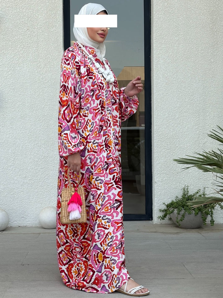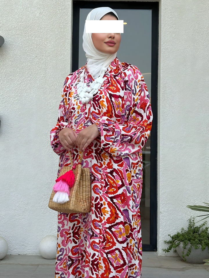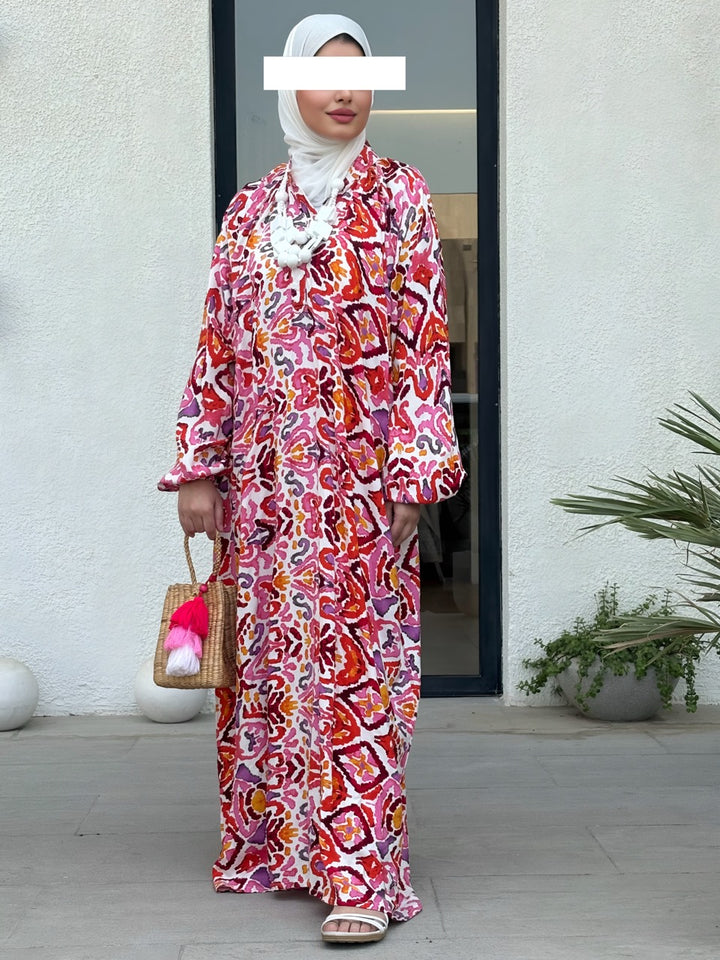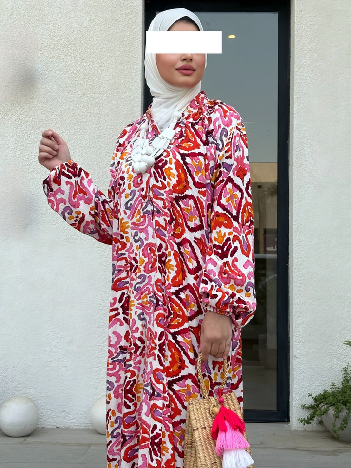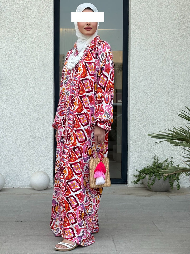 اختاري جرعة أناقة جريئة مع نفنوف براد عجيب بتصميم إسباني مبتكر يجمع بين القصّة الواسعة المريحة والنقشات الغرافيكية الملونة بدرجات الأخضر والوردي والأصفر. الخامة خفيفة وباردة مناسبة للصيف، والقصة الطويلة المحتشمة تمنح حرية حركة وأناقة يومية تليق بالمشاوير، السفر، والتجمعات العائلية. أزرار أمامية عملية، وأكمام منفوخة تعطي لمسة أنثوية راقية يسهل تنسيقها مع شنط وإكسسوارات بارزة.