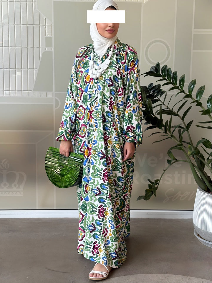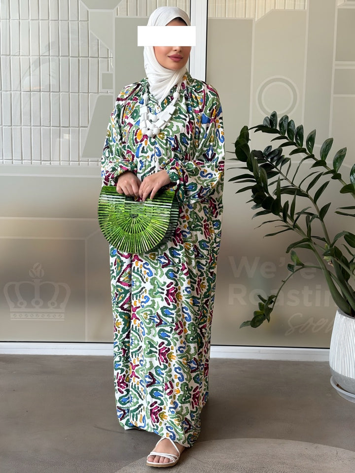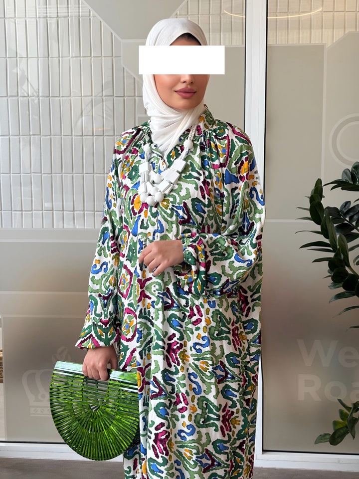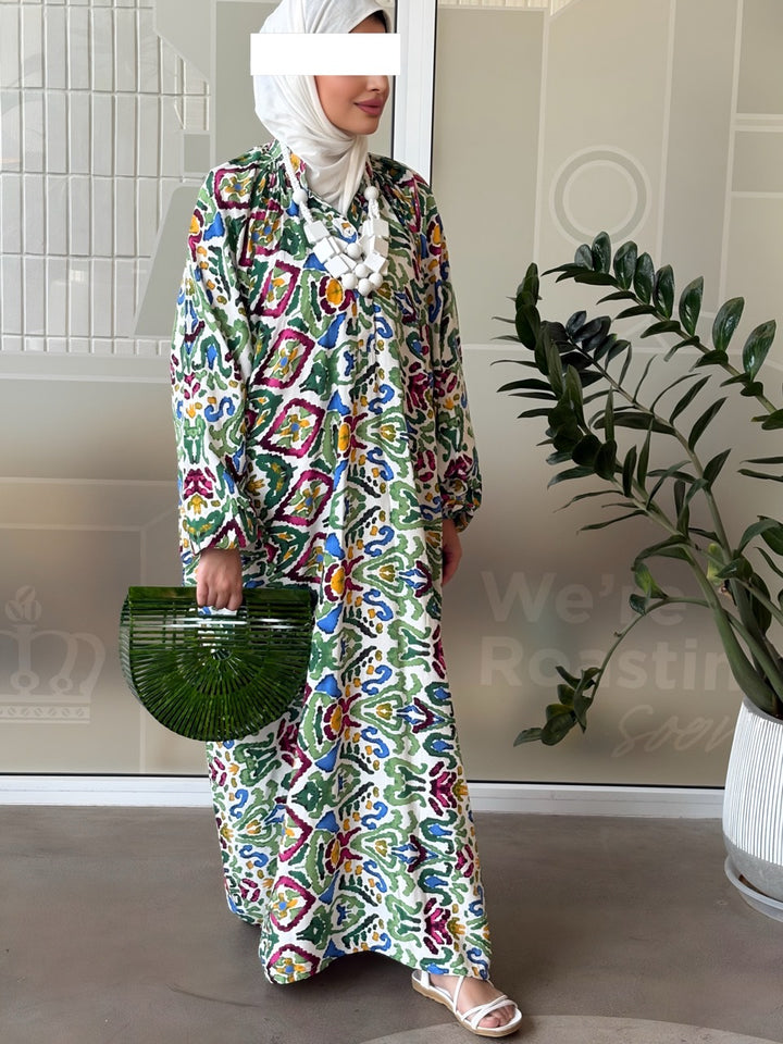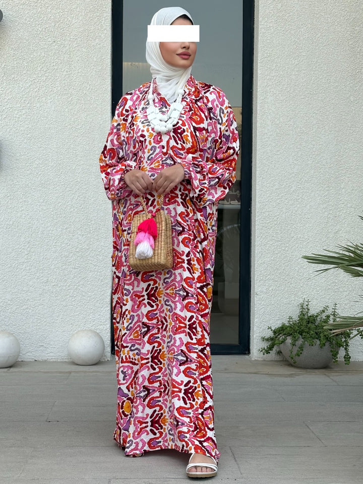 اختاري جرعة أناقة جريئة مع نفنوف براد عجيب بتصميم إسباني مبتكر يجمع بين القصّة الواسعة المريحة والنقشات الغرافيكية الملونة بدرجات الأخضر والوردي والأصفر. الخامة خفيفة وباردة مناسبة للصيف، والقصة الطويلة المحتشمة تمنح حرية حركة وأناقة يومية تليق بالمشاوير، السفر، والتجمعات العائلية. أزرار أمامية عملية، وأكمام منفوخة تعطي لمسة أنثوية راقية يسهل تنسيقها مع شنط وإكسسوارات بارزة.
