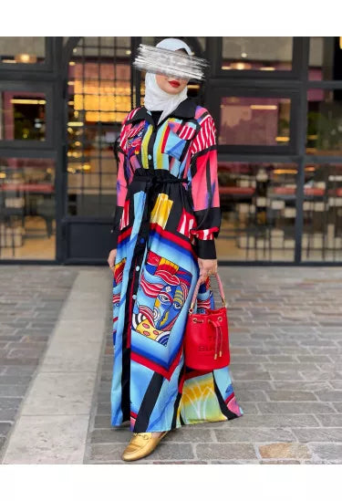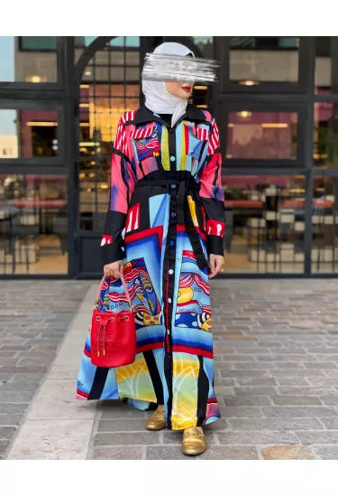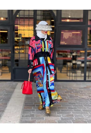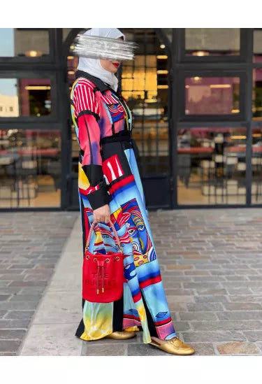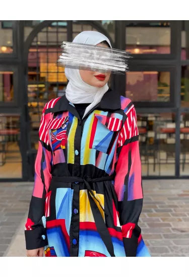 الخامة ناعمة وعالية الجودة، مثالية للارتداء اليومي أو المناسبات، وتوفر راحة وأناقة في نفس الوقت. النقشات الملوّنة المستوحاة من الفن الحديث تمنح القطعة طابعاً فريداً وجريئاً يناسب ذوق المرأة العصرية.