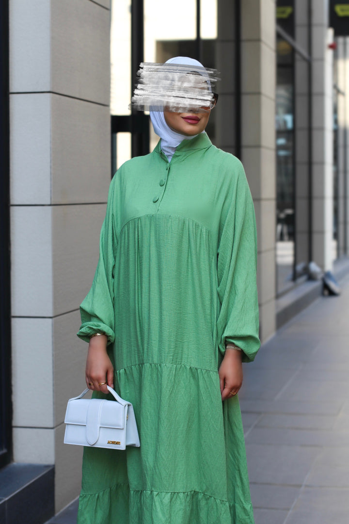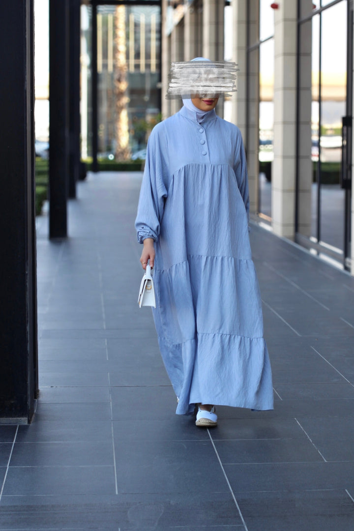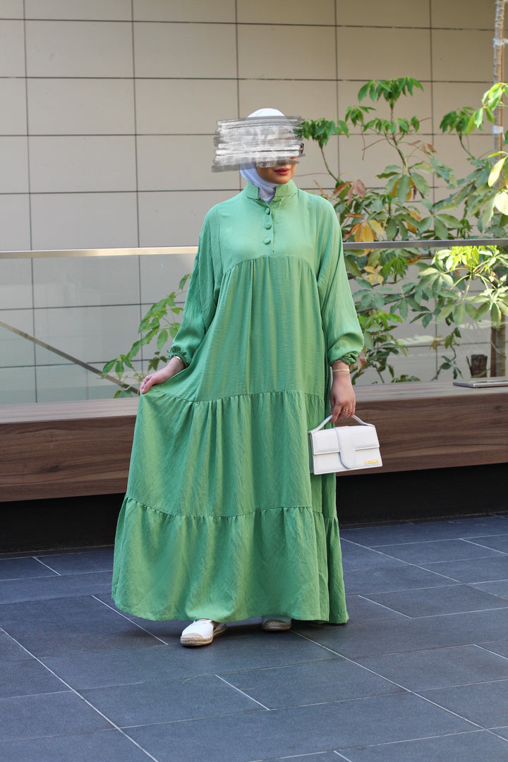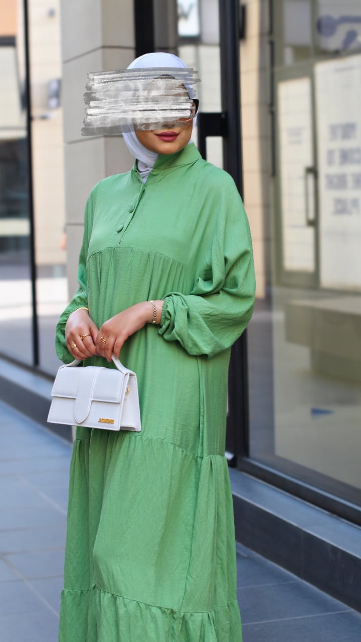 تصميم الفستان بطبقات ناعمة يبدأ من الخصر وينسدل بانسيابية رشيقة، مع ياقة مرتفعة وأزرار أمامية تضيف لمسة رسمية بسيطة، ليجمع بين العملية والأناقة في قطعة واحدة.