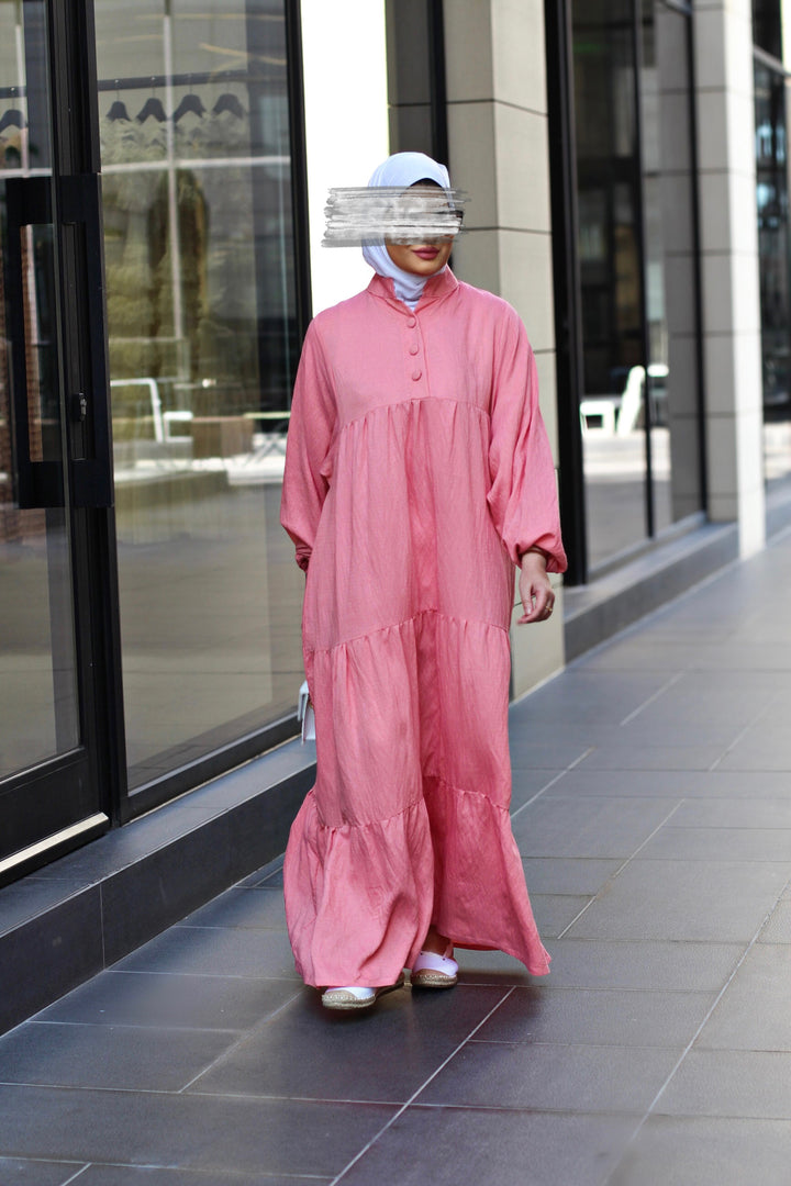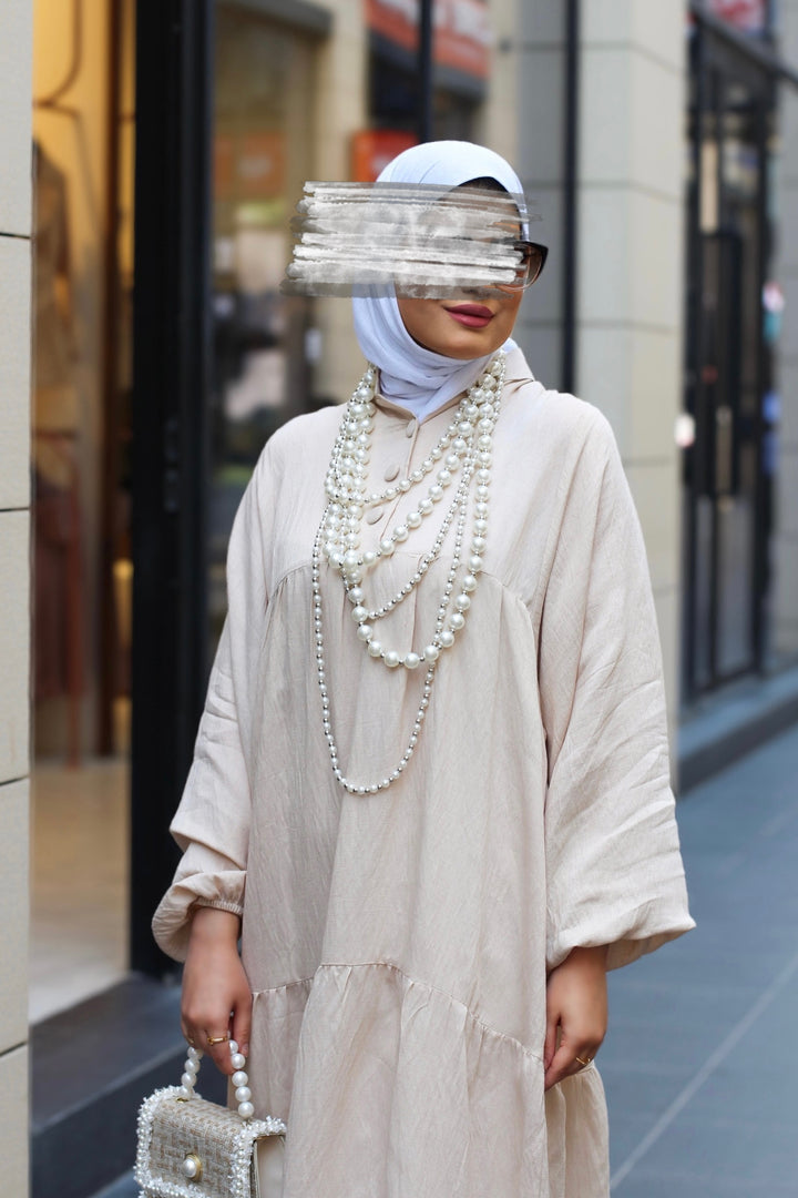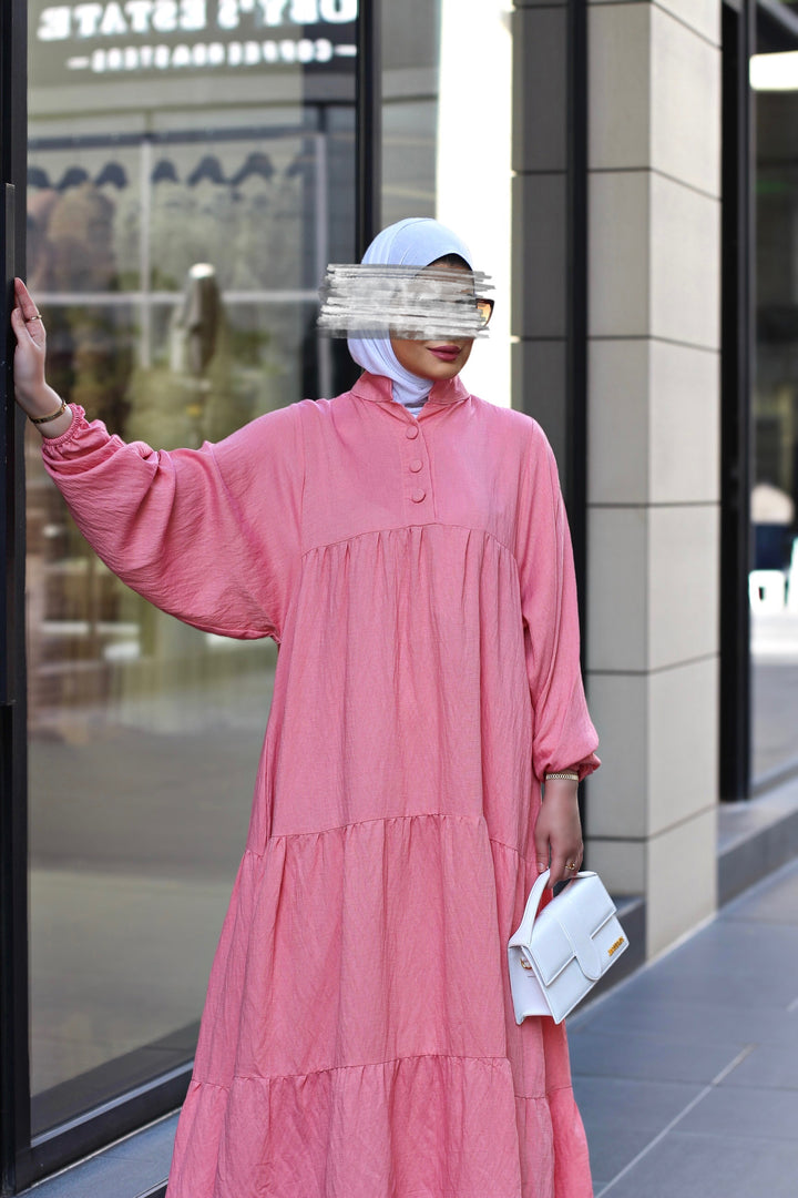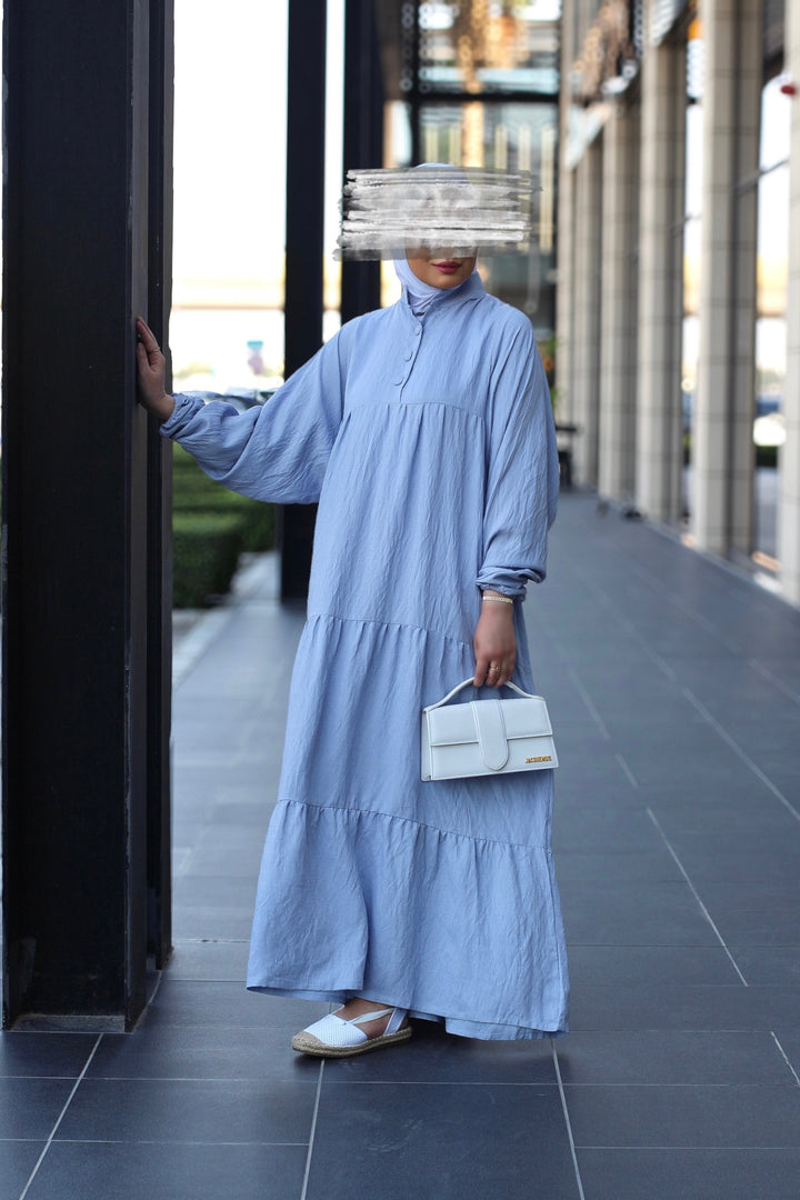 تصميم الفستان بطبقات ناعمة يبدأ من الخصر وينسدل بانسيابية رشيقة، مع ياقة مرتفعة وأزرار أمامية تضيف لمسة رسمية بسيطة، ليجمع بين العملية والأناقة في قطعة واحدة.